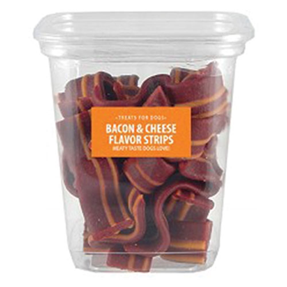 These bacon and cheese flavor strips are treats your dog will love to eat. Formed to look like strips of bacon, the treats have a meaty taste. Made by Sunshine Mills, this is a 10 ounce package of dog treats.