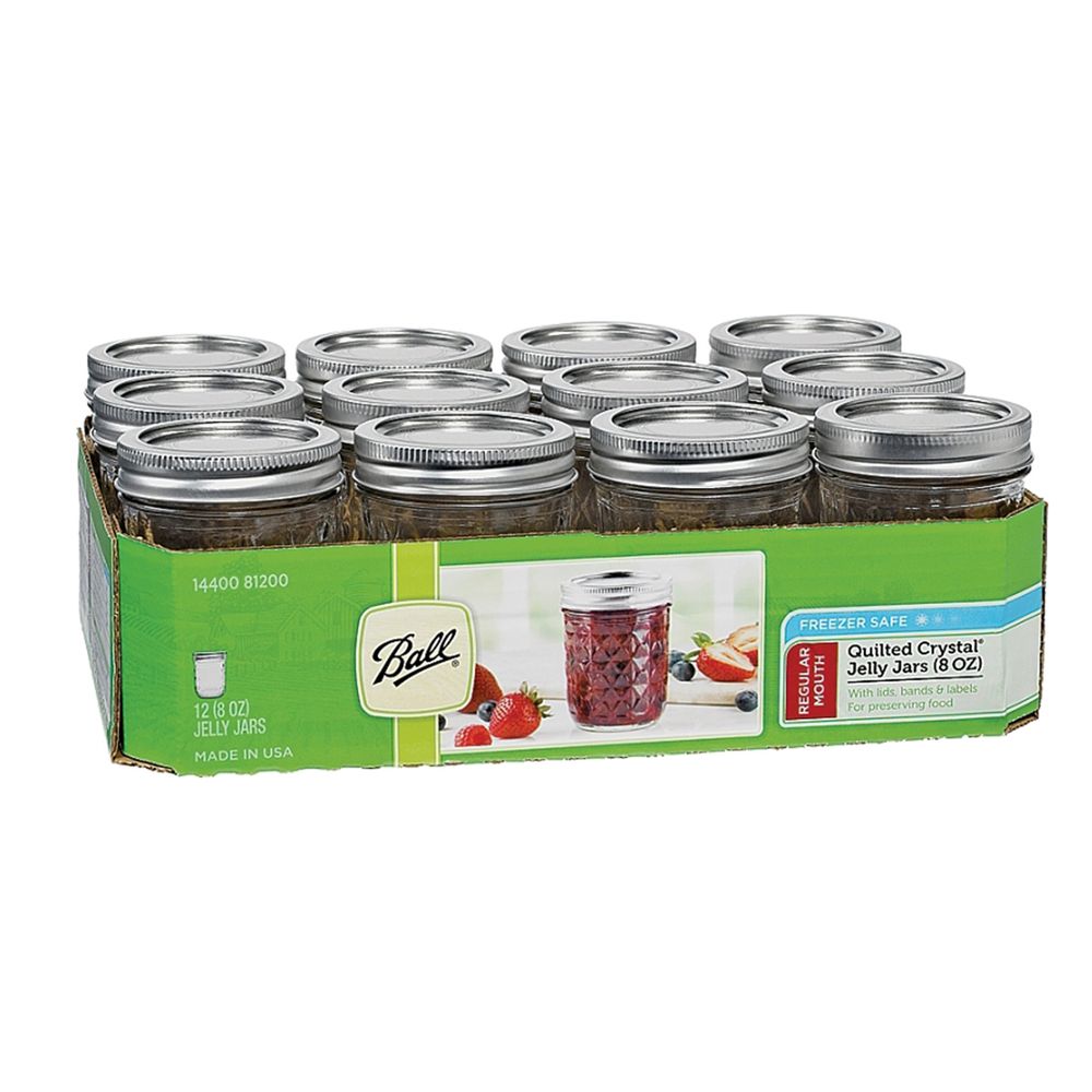 Store your favorite jellies and homemade jams in this small, 8 oz. jelly jar. Created by the popular BallĀ® brand, these jars have a decorative quilted design, making them perfect for serving or gift-giving. This set of twelve jelly jars includes matching lids and reusable bands. The glass jars and bands are dishwasher safe.