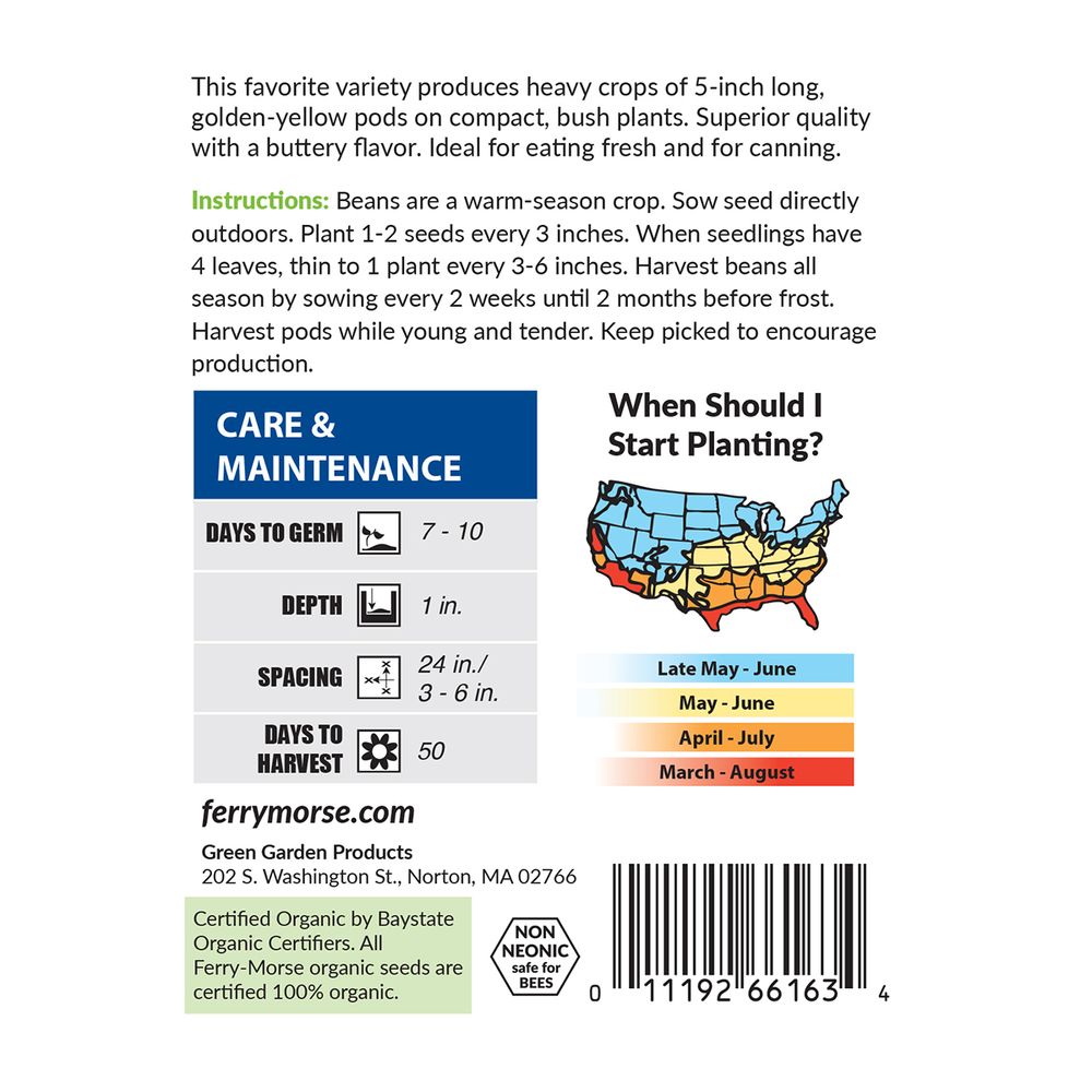 This packet of Ferry Morse® Organic Golden Wax Bean Seeds will produce 5 to six inch long flavorful stringless yellow wax beans.