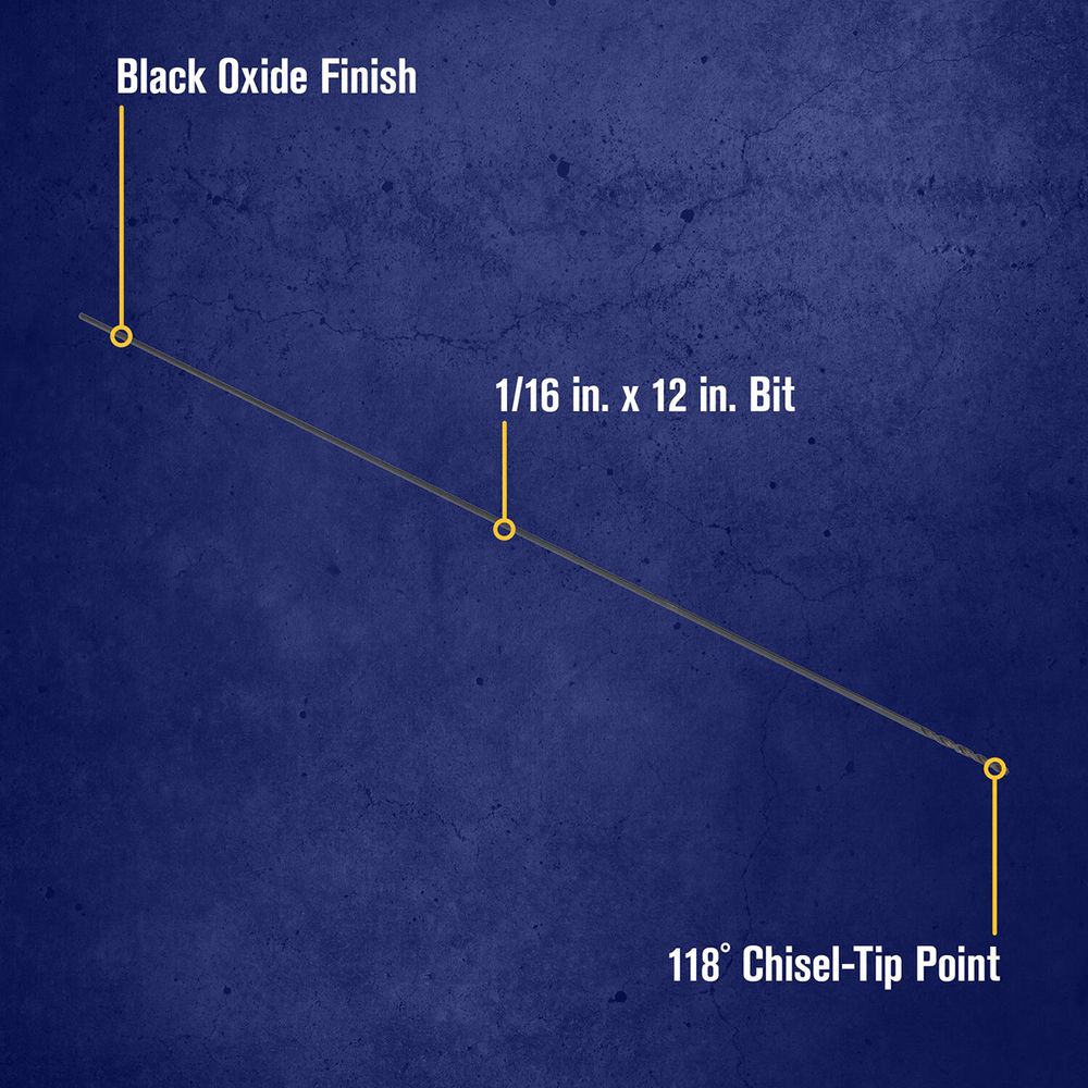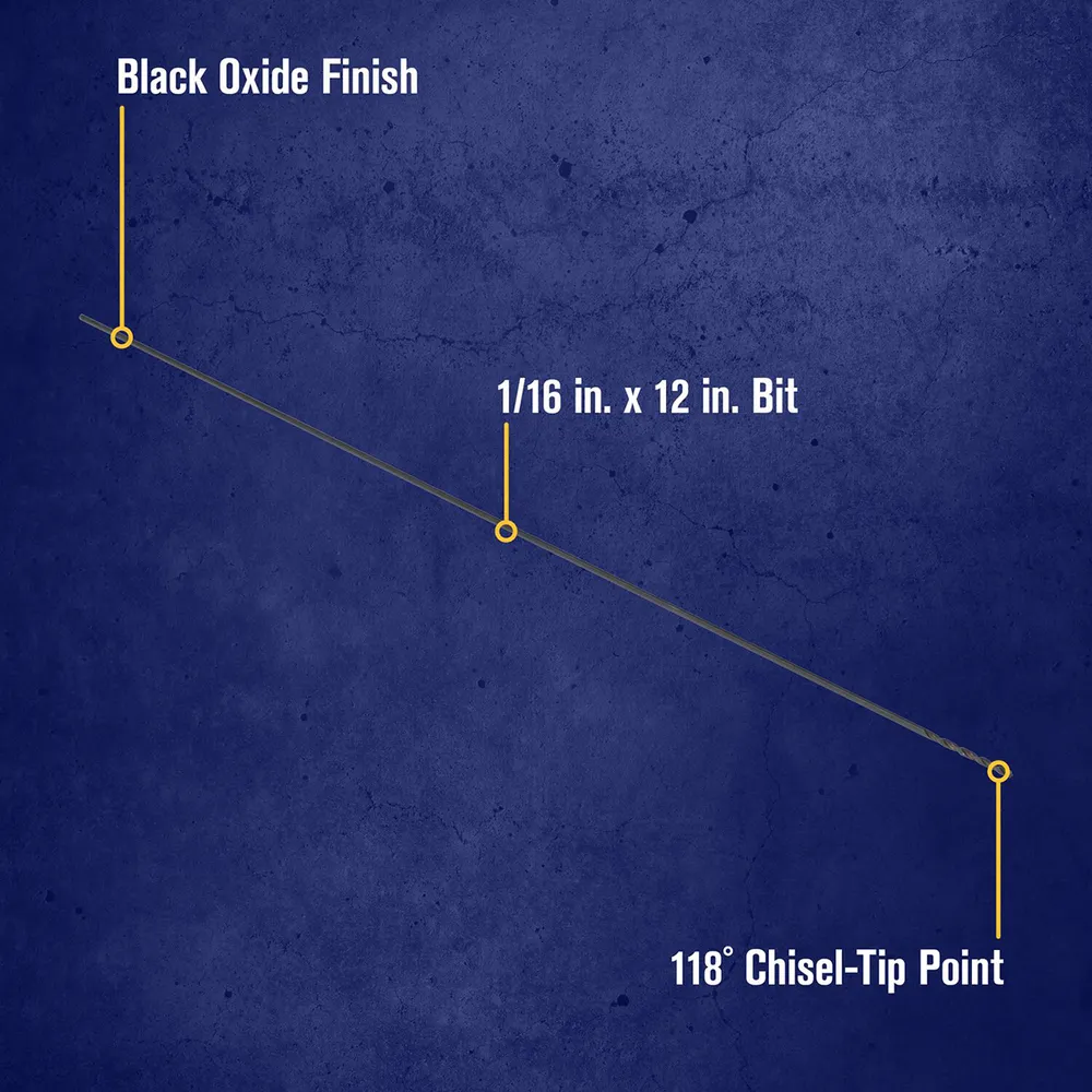 This 1/16" x 12" black oxide high-speed steel drill bit is ideal for extended reach applications. It is constructed of M-2 high-speed steel for the best combination of strength, heat resistance, and wear.