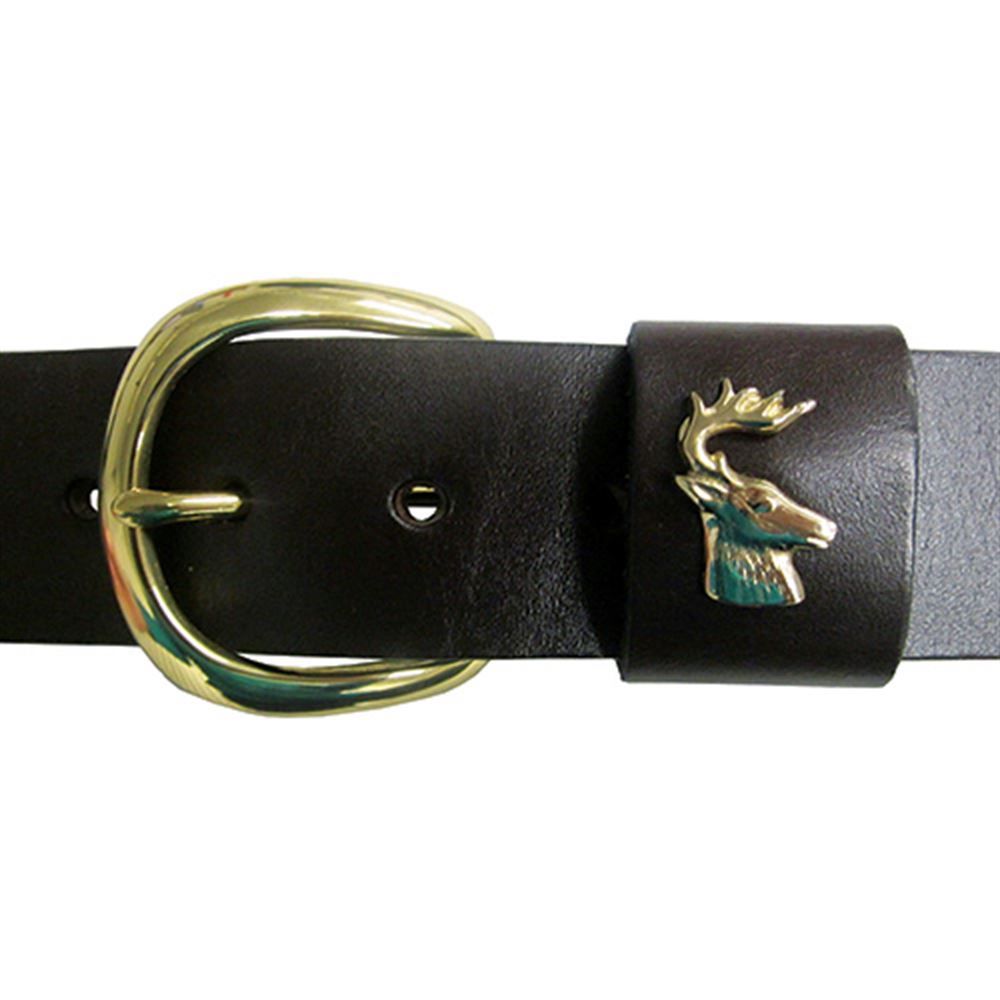 Display your love for hunting with this top grain leather belt. Constructed from one piece of leather, it is tanned to a deep mahogany color and does not have any liners or fillers. The polished brass buckle matches a brass casting of a buck's head that sits on the keeper of the belt.