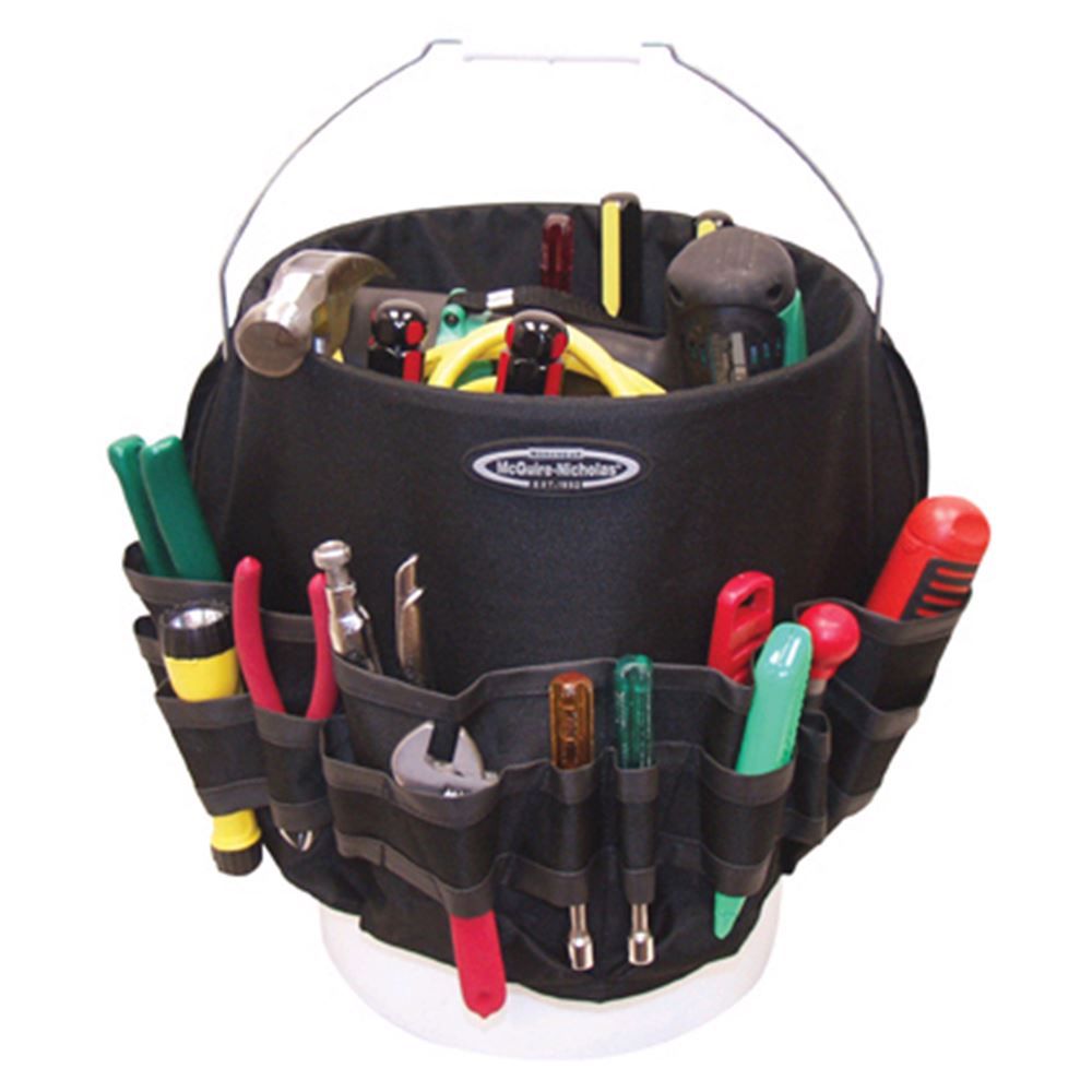 54 Pocket Builder's Toughwear Bucket Pro Caddy: This 54 Pocket bucket tool organizer was made for the pro. The pockets keep tools organized and protected. It has tapered tool tunnels for quick access to tools and has short, box pockets for separate small parts. It will fit most 5 gallon buckets. This caddy is made from Toughwear; this fabric is the most widely used fabric in the world. Proven for durability, this material is lightweight, puncture and tear resistant, water resistant and comfortable to wear.