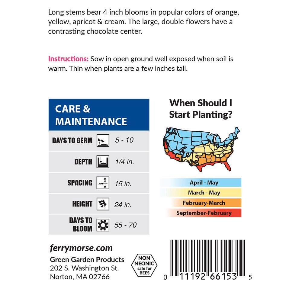 Pacific Beauty Calendula flowers have long stems with 4 inch blooms of orange, yellow, apricot and cream with chocolate centers.