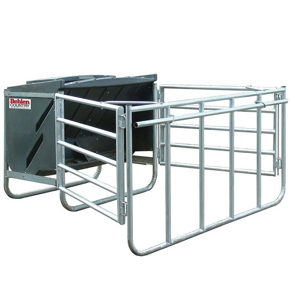 This Calf Creep Feeder is built with one-piece poly feed hoppers which feature molded-inside deflectors to provide protection from rainwater. Tall side height of grill and trough keeps large animals from reaching into feed area.