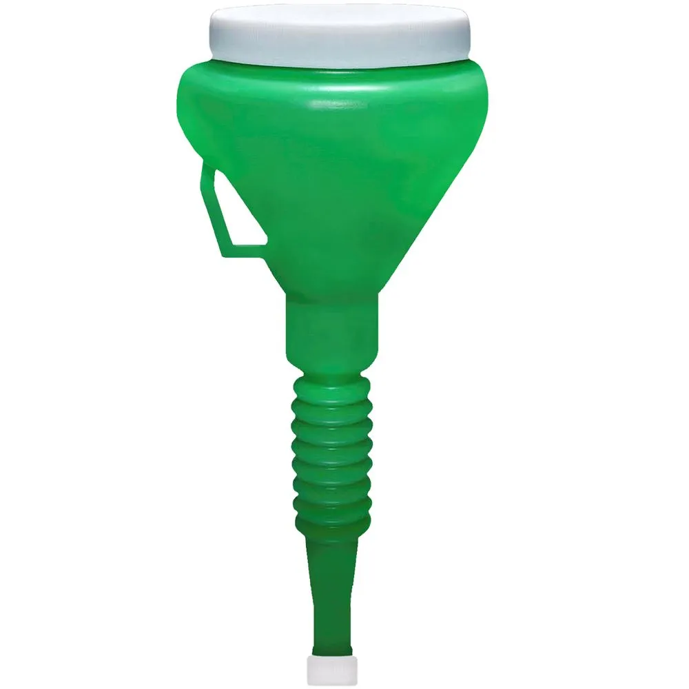 To help eliminate dirt and debris from getting inside this garden funnel there are two screw on caps, one at the top and one at the bottom. This helps protect the liquid from getting contaminated by harmful substances that could harm the liquid if there was no lid. The funnel is constructed from a plastic like polyethylene which is green in color, and the caps are constructed from polypropylene. The height of this automotive funnel is 14 in. and the larger top opening is 4-7/8 in. It can hold up to 1-1/2 quarts of fluid.