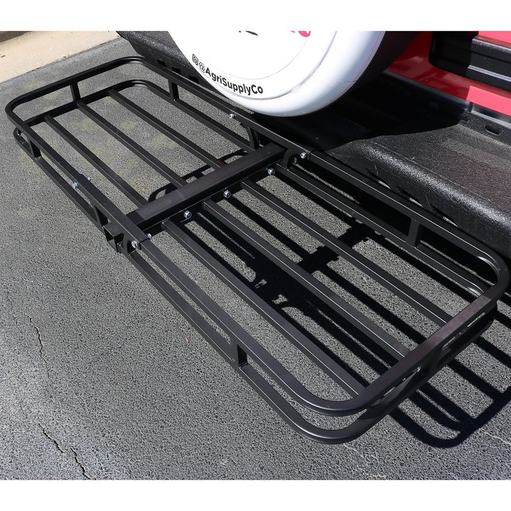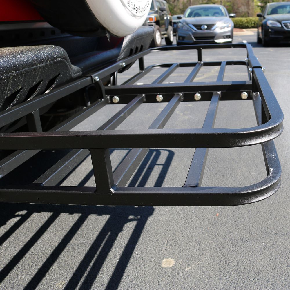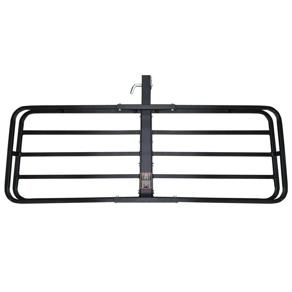 Store luggage, camping and fishing gear, or work equipment onto this steel cargo rack. It measures 53 inches long x 19 inches wide, and features 4-1/8 inch tall side rails that help retain cargo when placed on the rack. Additional tie-downs and support straps are not included. Overall this cargo rack has a powder coated finish for protection against harsh weather conditions. This cargo hitch is compatible with any standard 2 in. receiver, and it can support up to 500 lbs.