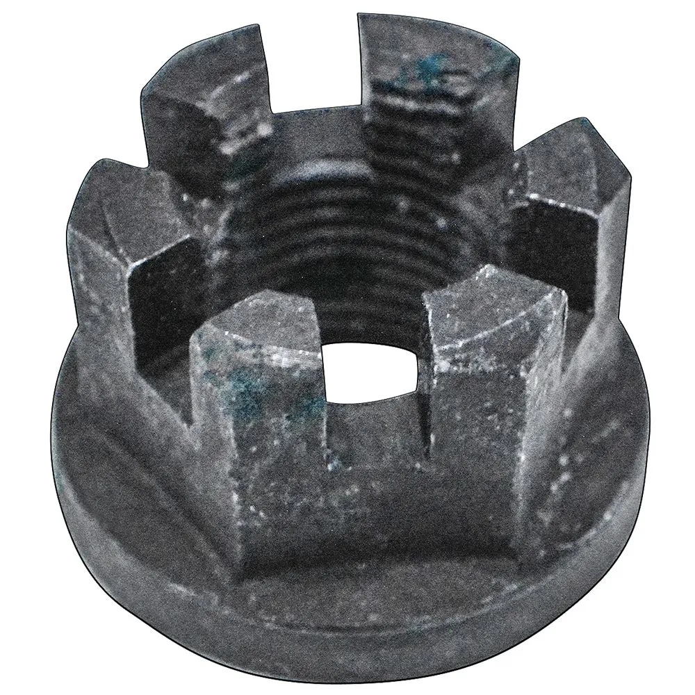 This is a replacement castle nut that is made to fit the gearbox of an 8' Agmate Estate mower. This castle nut has an inside diameter of 7/8" and an outside diameter of 1-3/4" and height of 1-3/16".