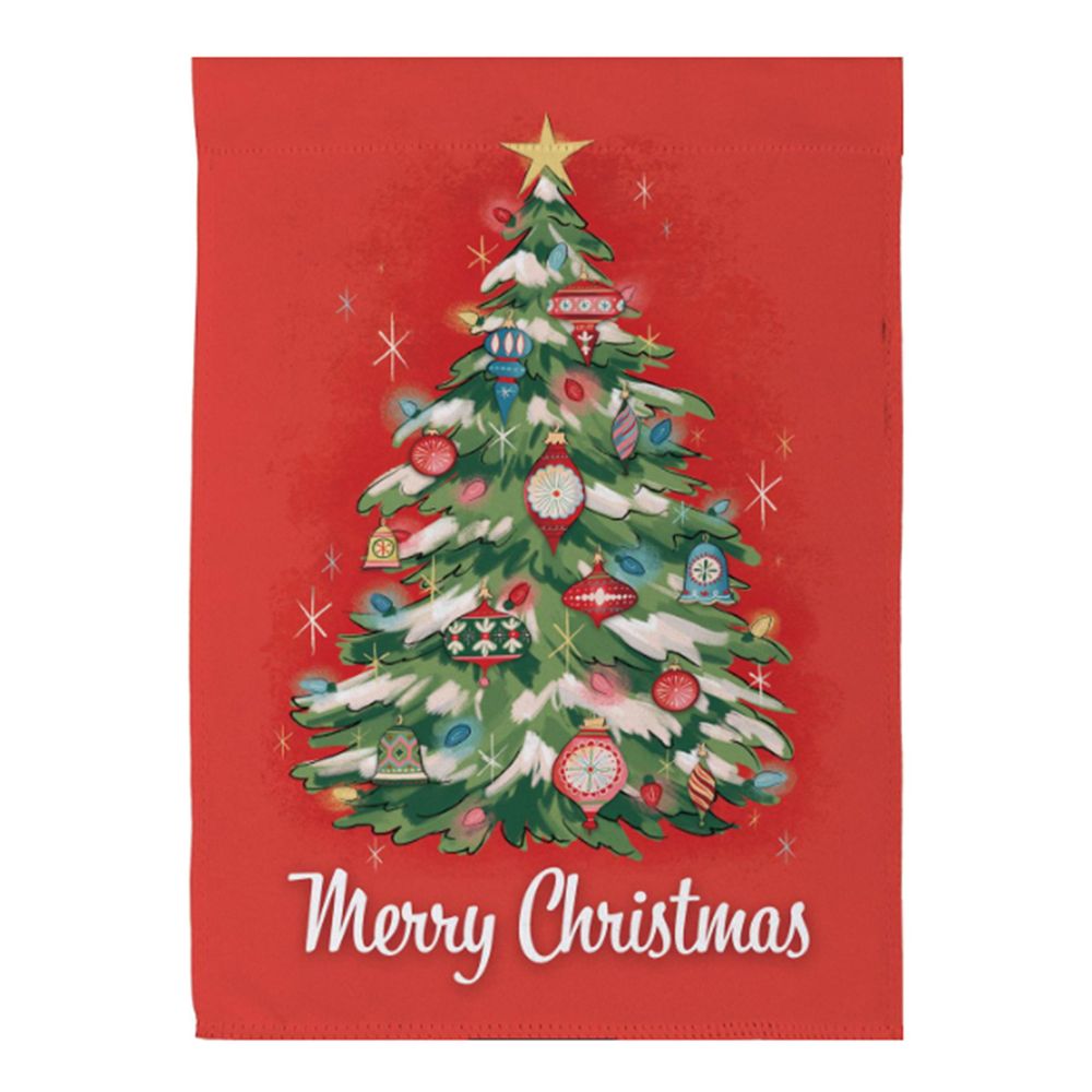 Beautiful decorations are shown on this Christmas Tree Suede Garden Flag sending greetings to neighbors and friends.