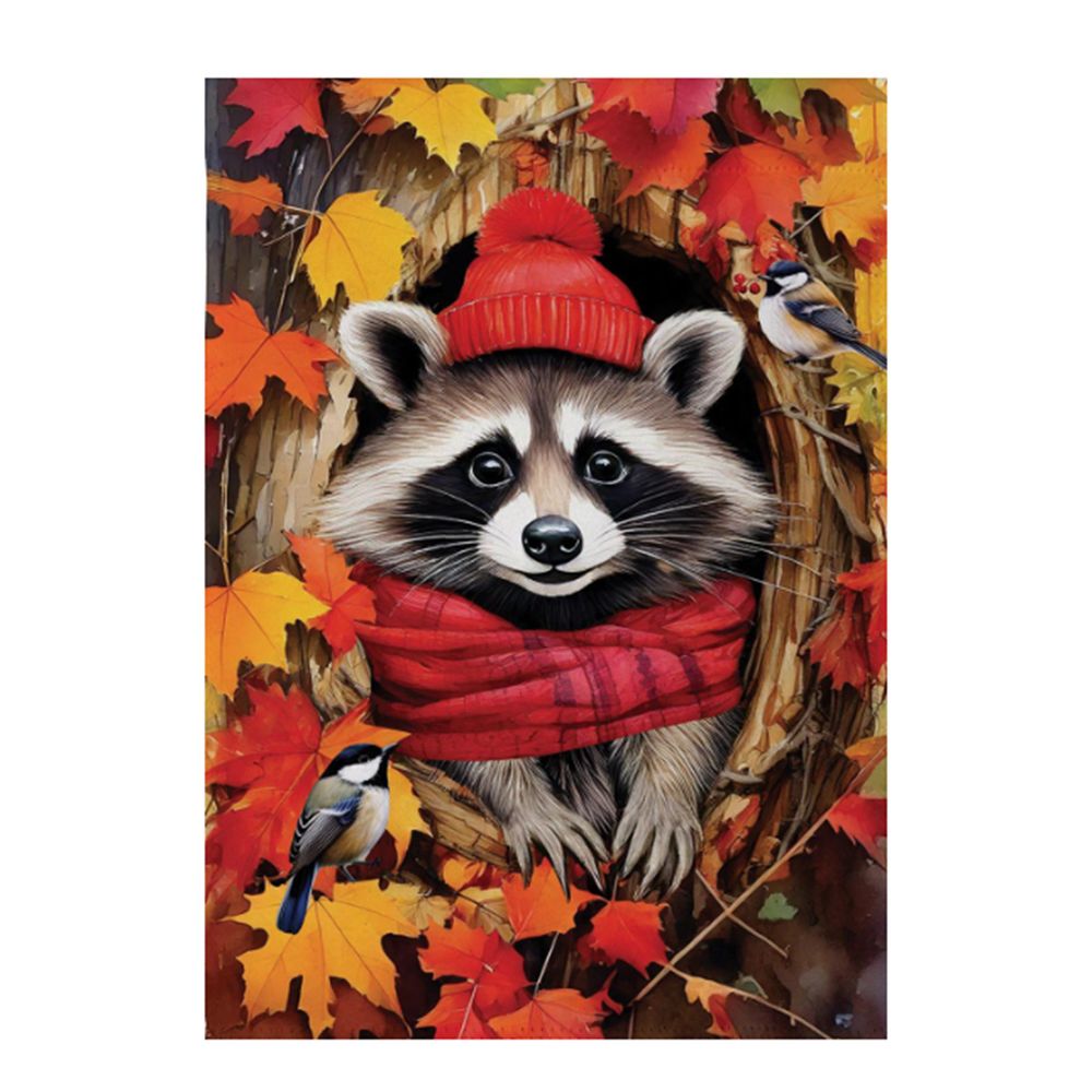 This Cozy Raccoon Suede Garden Flag featuring fall colors will look great in your garden or on your porch.