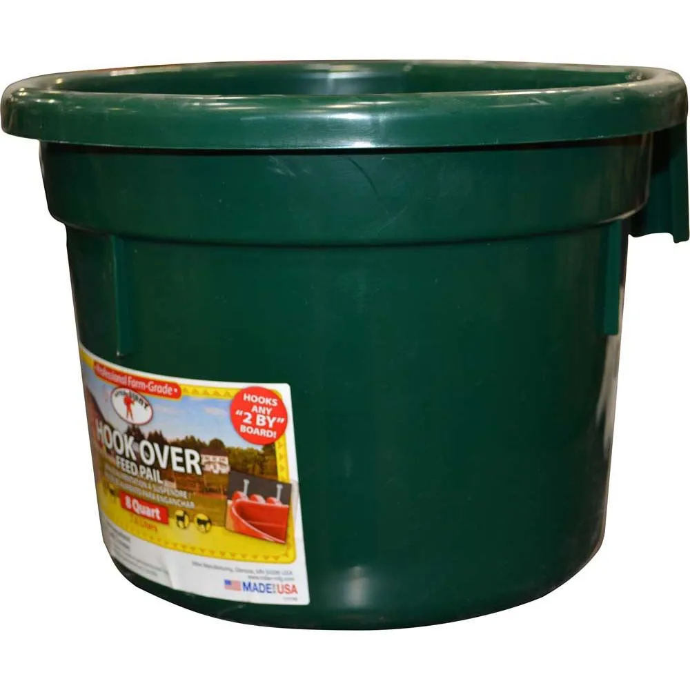 Molded-in bracket fits easily over any 2-by-wide board to create a sturdy feed pail anywhere, with no tools or installation required. Two eyelets allow for permanent mounting with screws if desired (screws not included). Perfect for goats, sheep, alpacas, llamas, and small horses. Impact-resistant DuraFlex plastic pail is 11.375 inch diameter by 8.5 inch high, 12.5-inch overall width including bracket; holds 8 quarts (2 gallons).