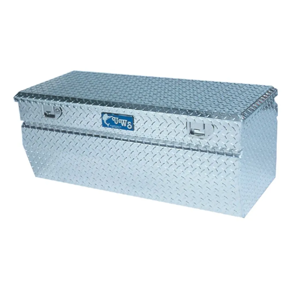 The D-TBC-60-W Aluminum wedge single lid chest box is 60 inches long x 20 inches wide x 17-1/4 inches high. It is a rectangular chest with a premium front wedge design. It is designed to sit inside the truck bed against the back of the cab leaving bed rails free for other uses. It is constructed of a 0.063-inch Aluminum One-Piece Tub and Lid and is designed to support heavy loads, absorb tool drops and prevent leakage. The offset hinge is designed to fit tight against the front of the bed and still allow the lid to open without rubbing. It has a patented fully foamed lid that creates a rigid wall between outer aluminum layers to help prevent bending or warping. The stainless steel paddle handle lock provides strength, security and rust-free product life. Self-closing struts automatically close the lid, with slight manual pull, securing the box when hands are full.