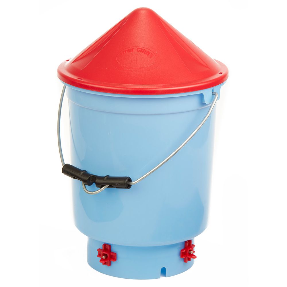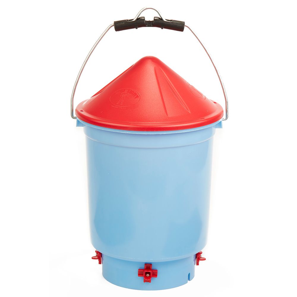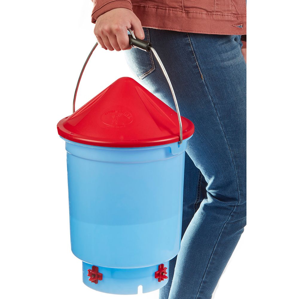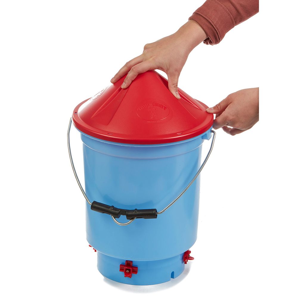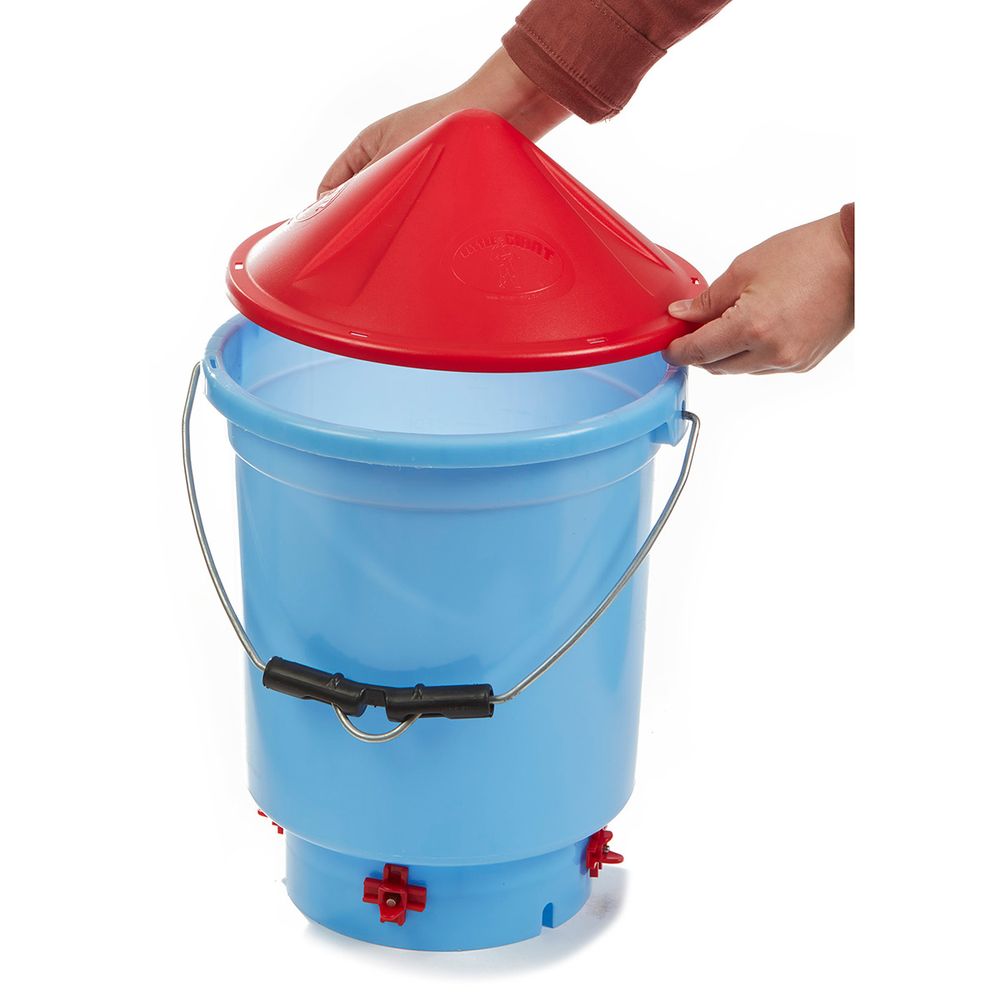 The Deluxe 3 Gallon Hen Hydrator is translucent and provides UV protection to prevent algae growth while allowing viewing of the water level. The lid locks by twisting and is sloped to prevent roosting. The unit can be hung and includes a Little Giant® patented Bucket Handle Grip. The Deluxe 3 Gallon Hen Hydrator gives access to up to 4 birds at a time. The Deluxe 3 Gallon Hen Hydrator should be hung at the bird's eye level. Meant for adult birds only.