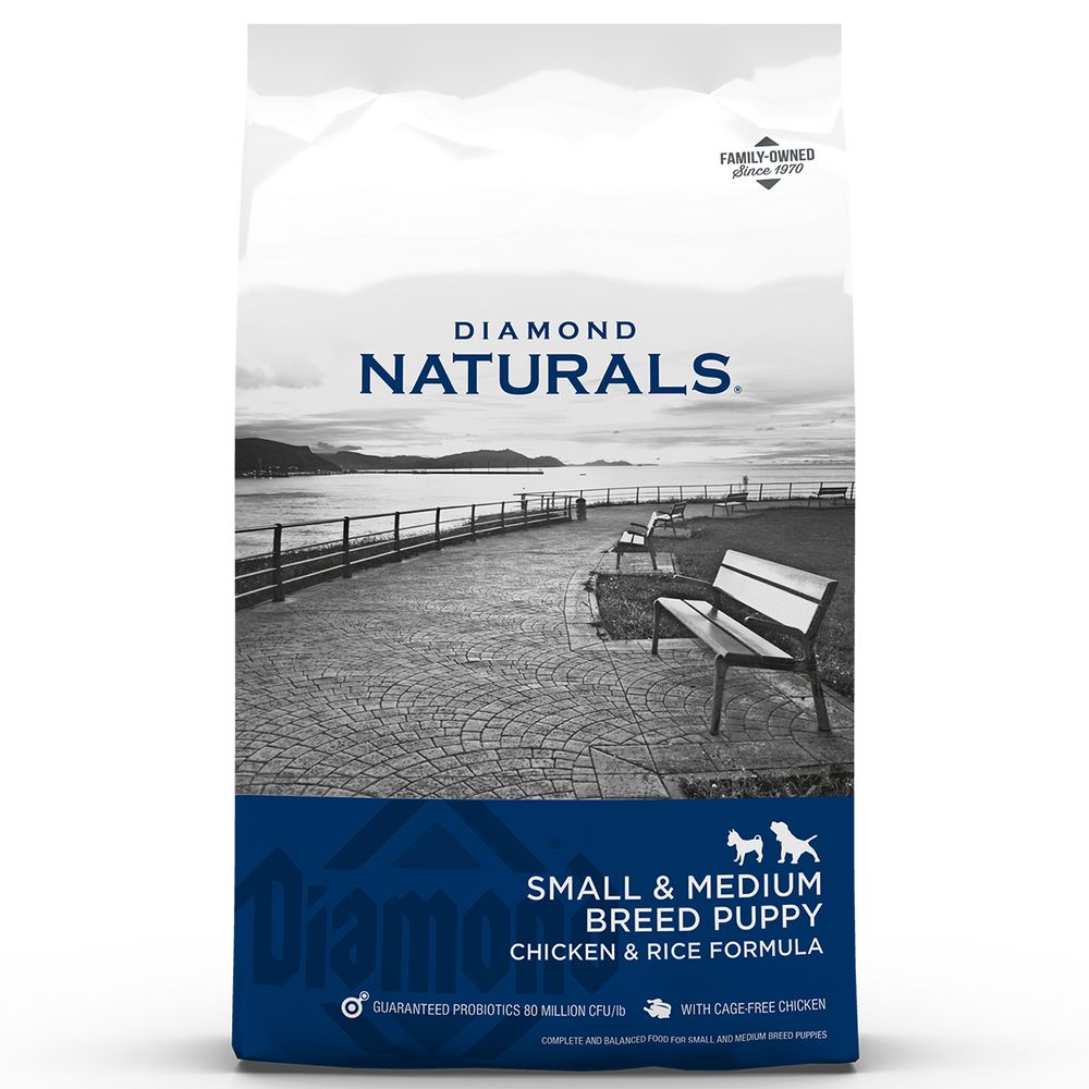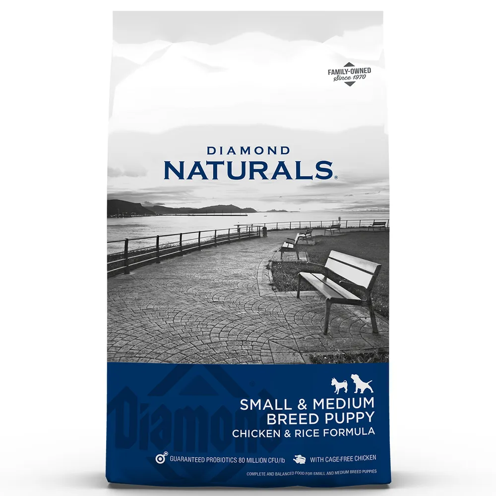 Diamond Naturals® Small & Medium Breed Puppy Feed Chicken & Rice is made for small and medium breed puppies and nursing adult dogs.