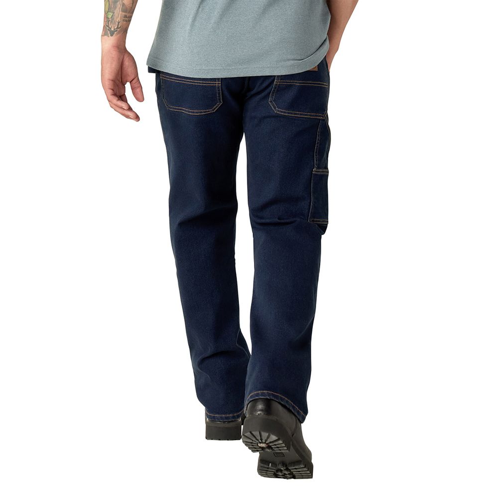 Made with double-needle stitching for reinforcement these jeans are a relaxed fit. These jeans feature a tape measure loop, utility, and ruler pockets an antique brass button, Made from 77% cotton/21% Polyester and 2% Elastane Denim.