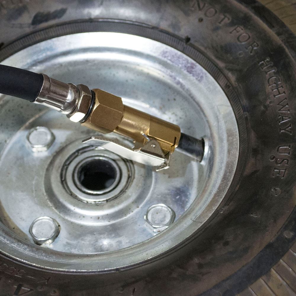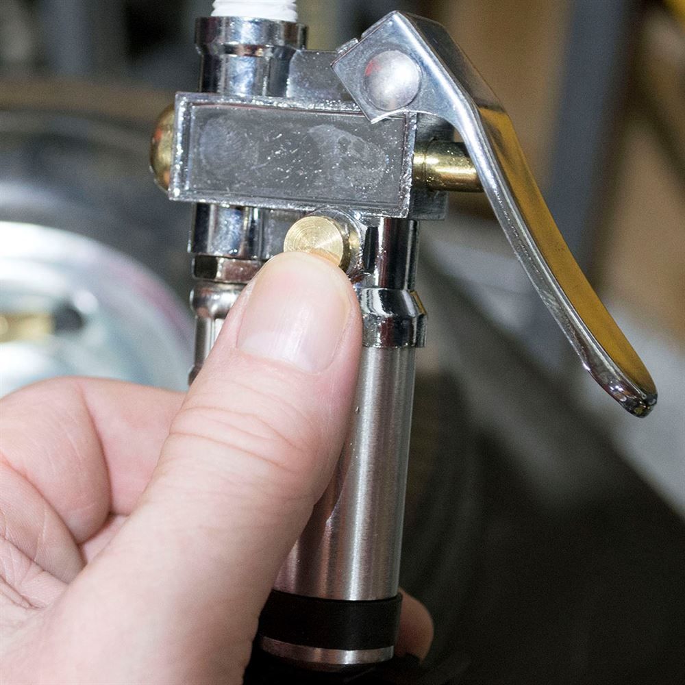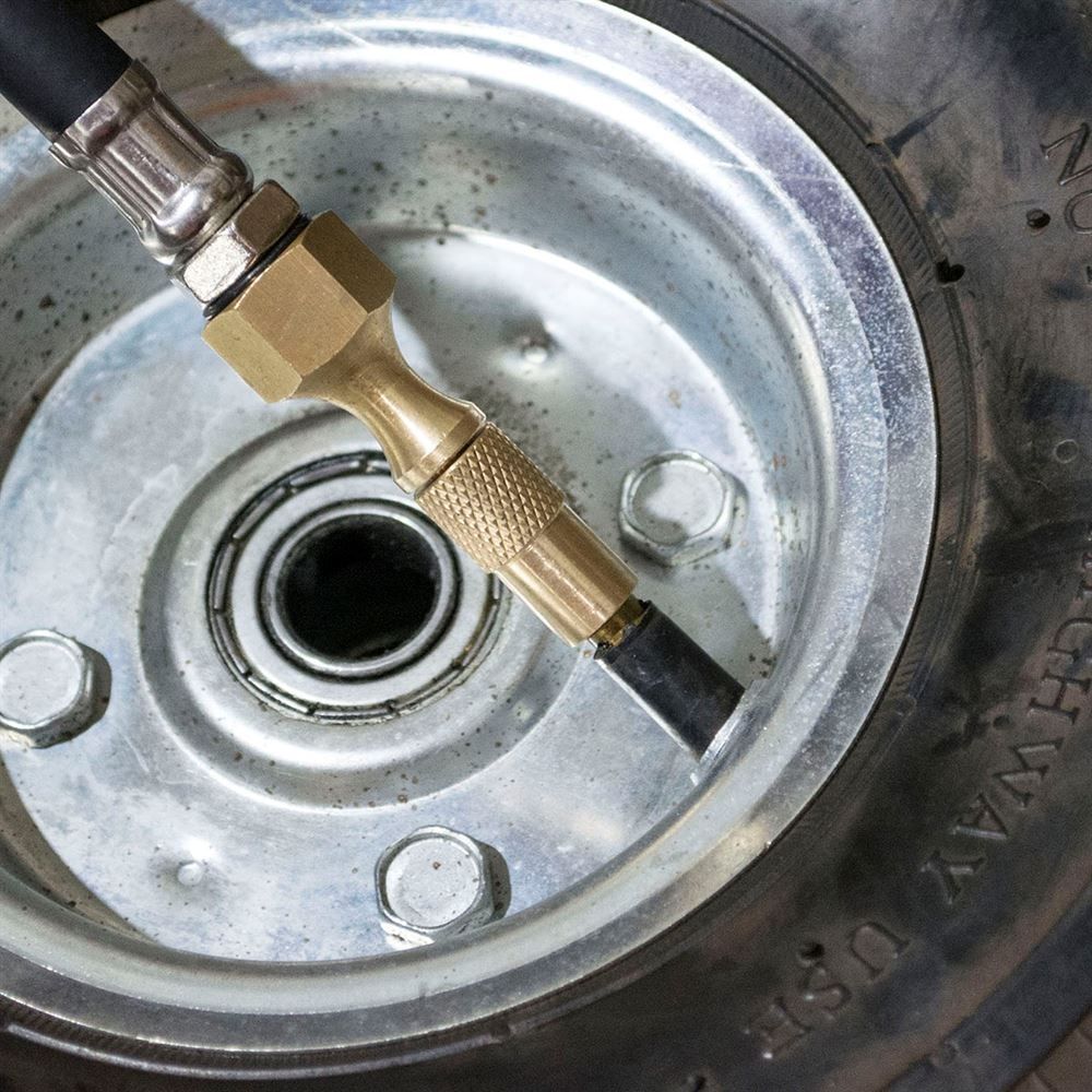 - Contains: (1) tire inflator gauge, (1) twist-on air chuck, (4) valve caps, (1) brass air chuck, (2) AAA batteries, (1) 1/4" NPT steel fitting, (1) 1/2" NPT steel fitting, (1) valve core tool