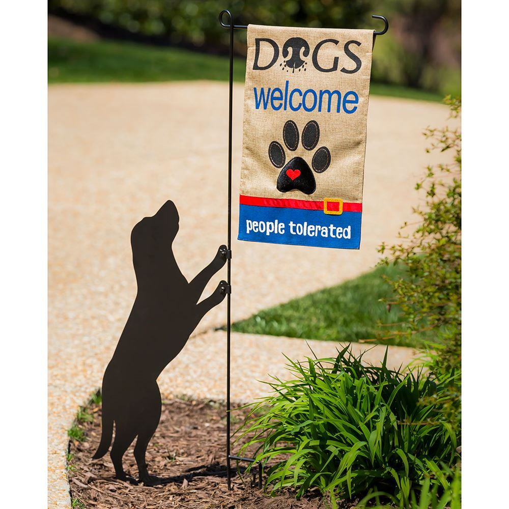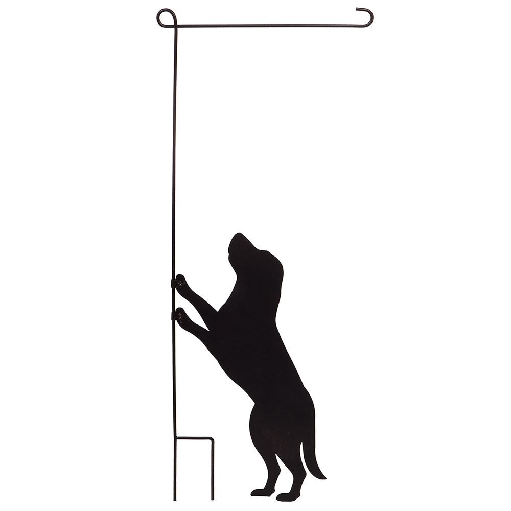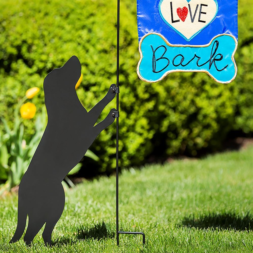 Weather-resistant 44" metal garden stand that features a silhouette of a dog jumping towards the dangling flag.