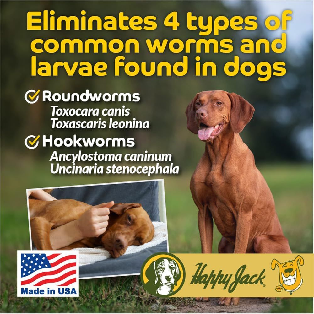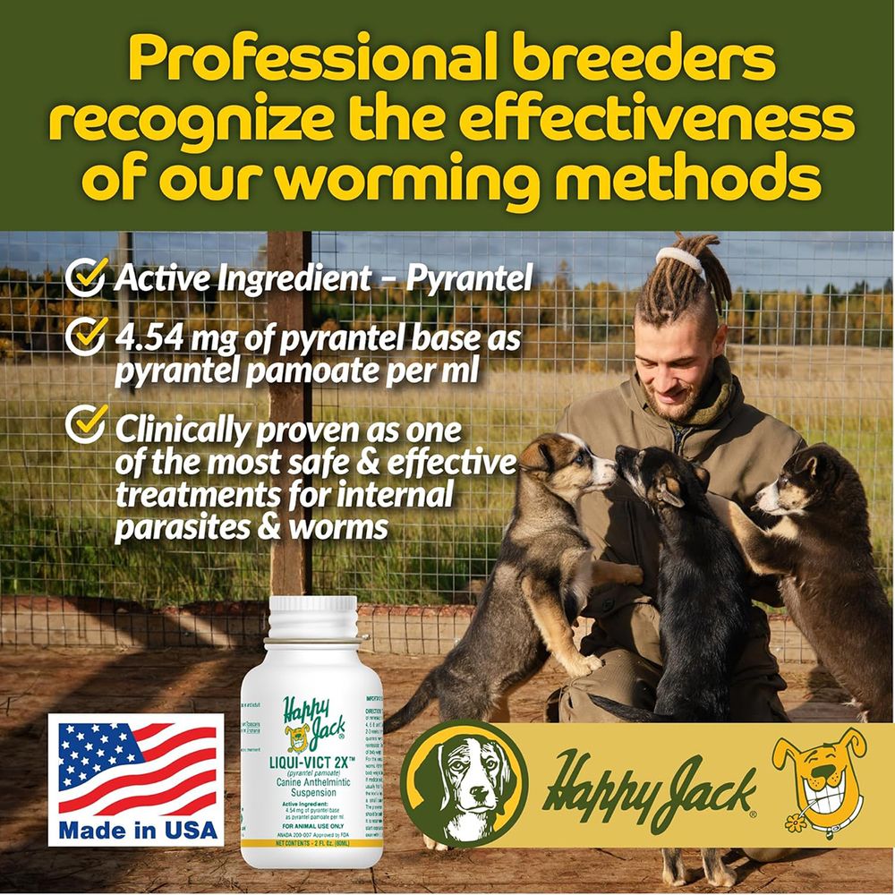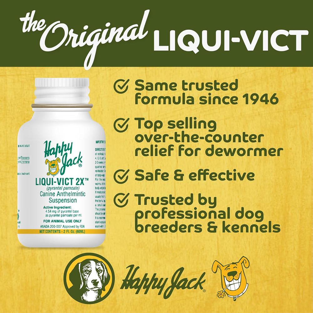 Dog Wormer Liqui-Vict 2X 2 Oz. - Another convenient wormer from Happy Jack for the removal of roundworms and hookworms. Simply measure appropriate amount of Liqui-Vict 2X with enclosed measuring spoon and mix with food. That's it! Each 2 oz. bottle worms 120 lbs. of body weight.