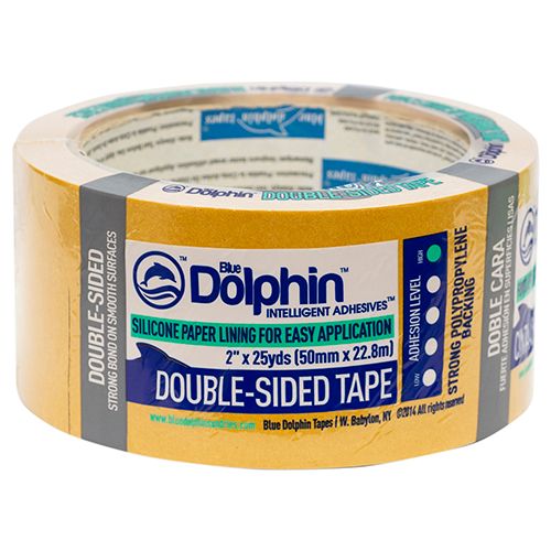 Blue Dolphin™ Double-Sided Tape is for use on linoleum or hanging plastic. The strong backing, silicone paper lining and high adhesion technology provide superior reliability on smooth interior surfaces.