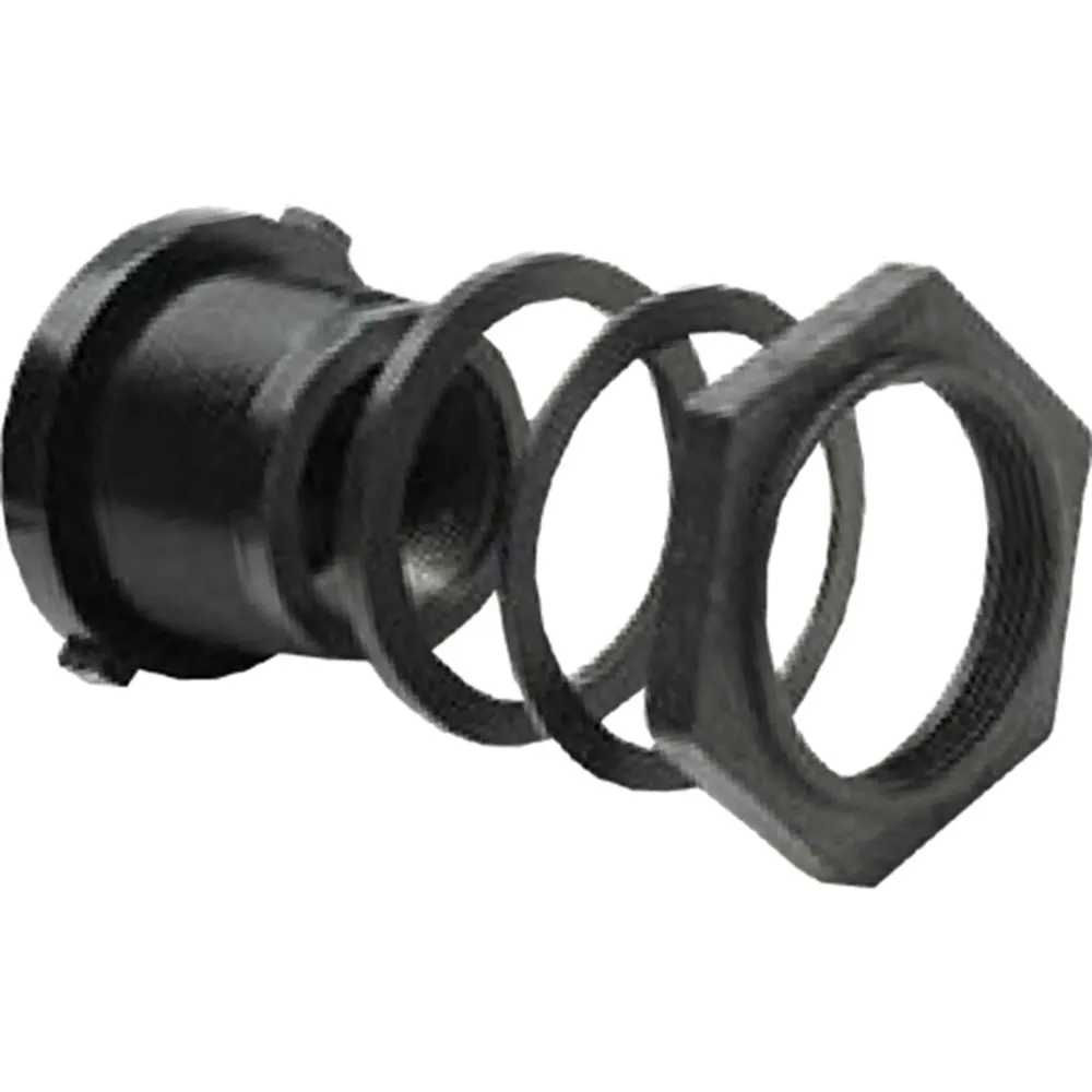 This double thread (both ends) EPDM gasket can be used for tubing connectors, spigots, and valves in tanks. This is a 2" heavy duty polypropylene tank fitting with a 3" hole size.