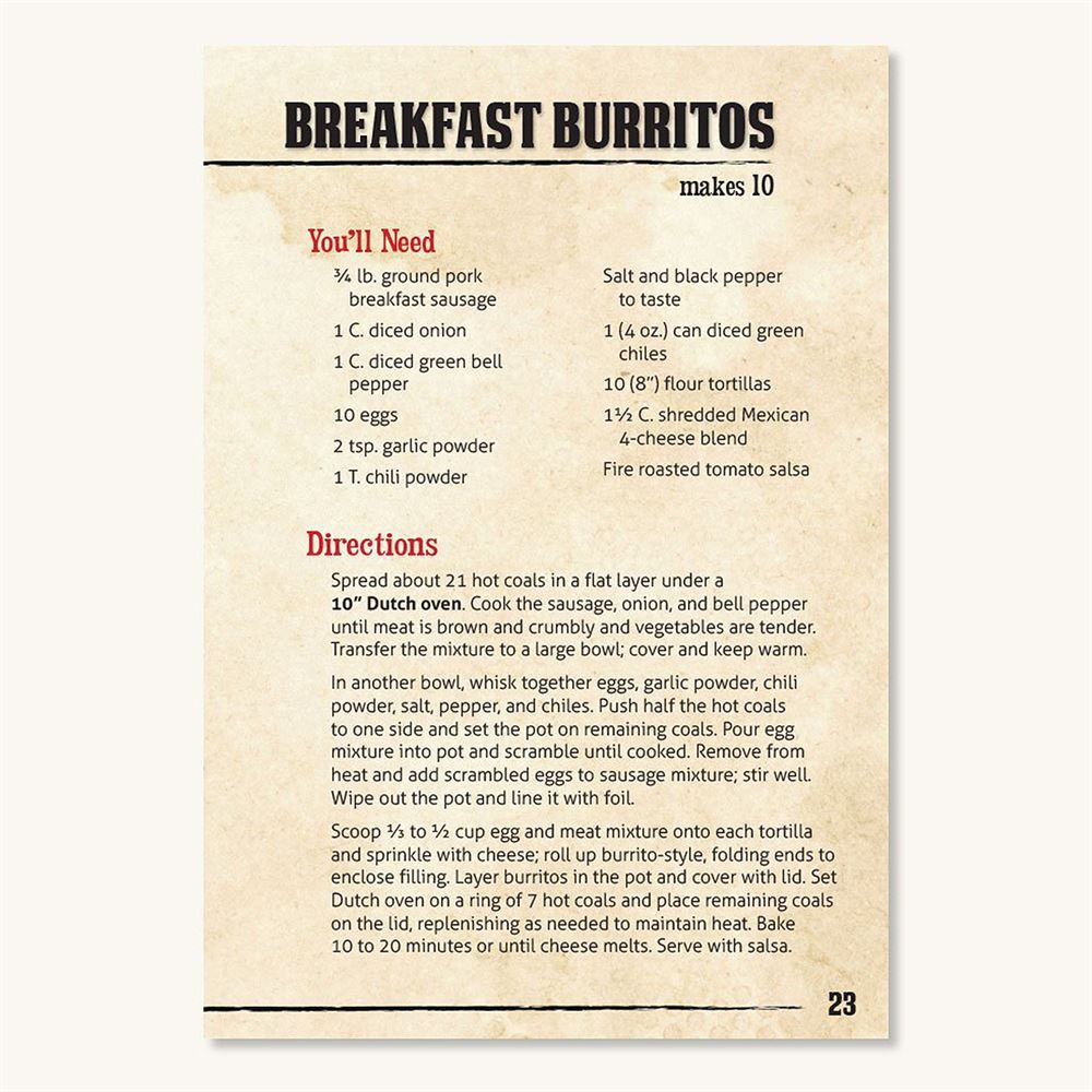 • Recipes include: Breakfast Pizza, Chicken Tortilla Soup, Cornbread, Campfire Lasagna, Blueberry Cobler, and much more