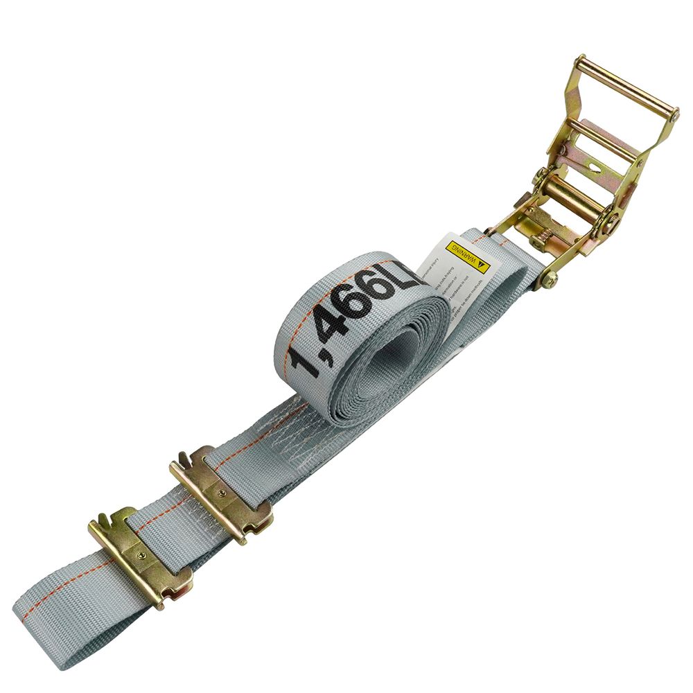 This E-track ratchet strap is constructed from thick polyester webbing, and the E-track locks into place once the strap is set. Both of these features work to keep the cargo secure. This durable strap has a working load limit of 1,466 lbs. and a breaking strength of 4,400 lbs. It has an excellent resistance against harsh weather conditions when used outdoors. This strap measures 2 inches wide x 16 feet long.