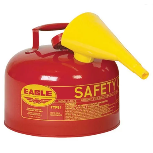 With a deep drawn seamless construction, this type 1 safety can includes an F-15 funnel. The spring closing lid has a neoprene gasket which vents at 5 PSI. If you need to store or transport gasoline, this Eagle safety can is approved for both. Measuring 10 in. high with a 11-1/4 in. diameter, this 2-1/2 gallon gas can is built to last with a 24-gauge hot dipped galvanized steel body. The red powder coated finish provides a durable exterior while the flame arrestor and pour spout are non-sparking for safety. Use this gas can to safely handle or store gas as needed.