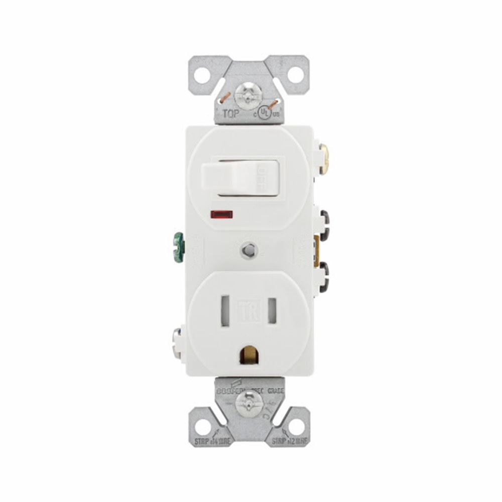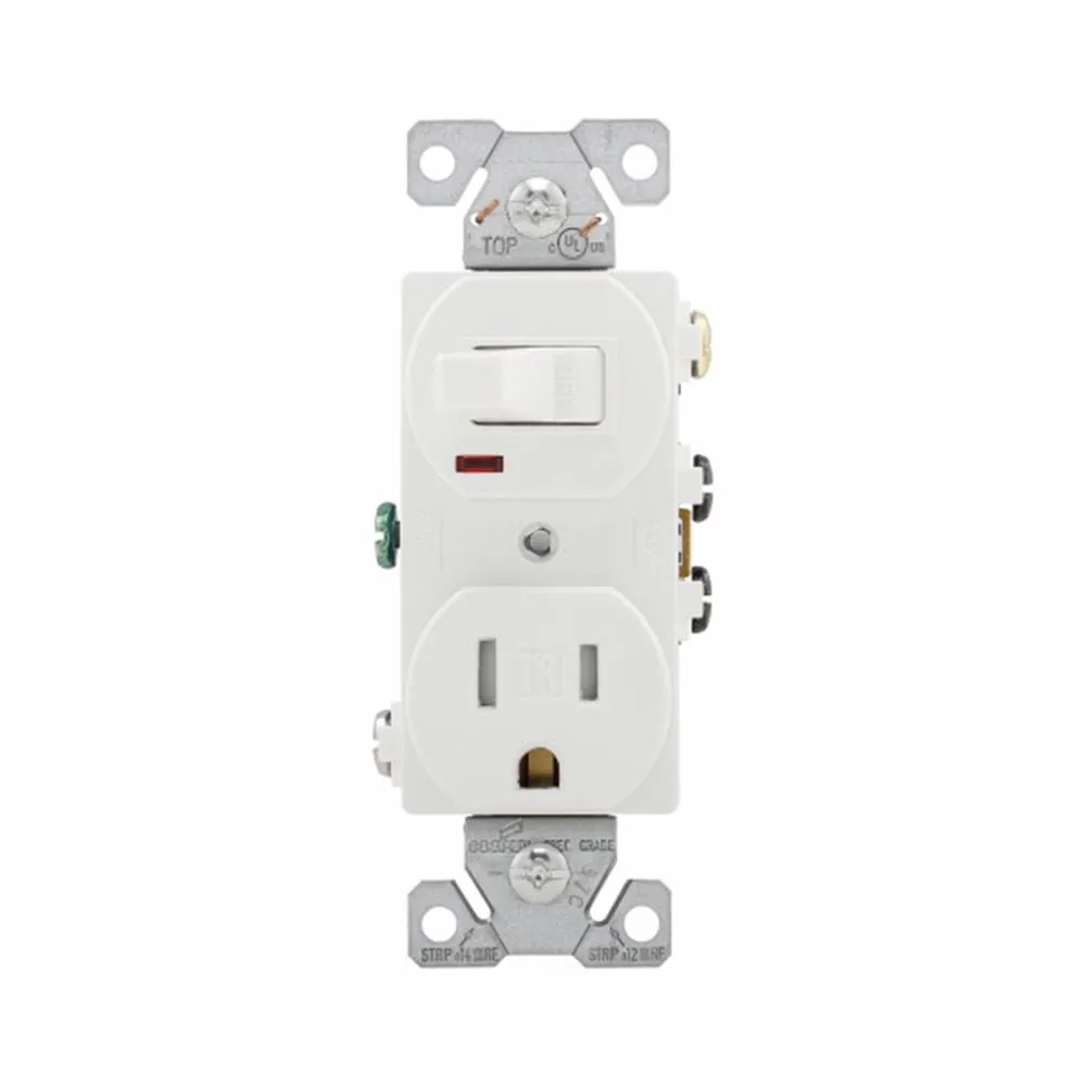 This is a white, tamper resistant, auto-grounding combination switch made from PVC and thermoplastic material.