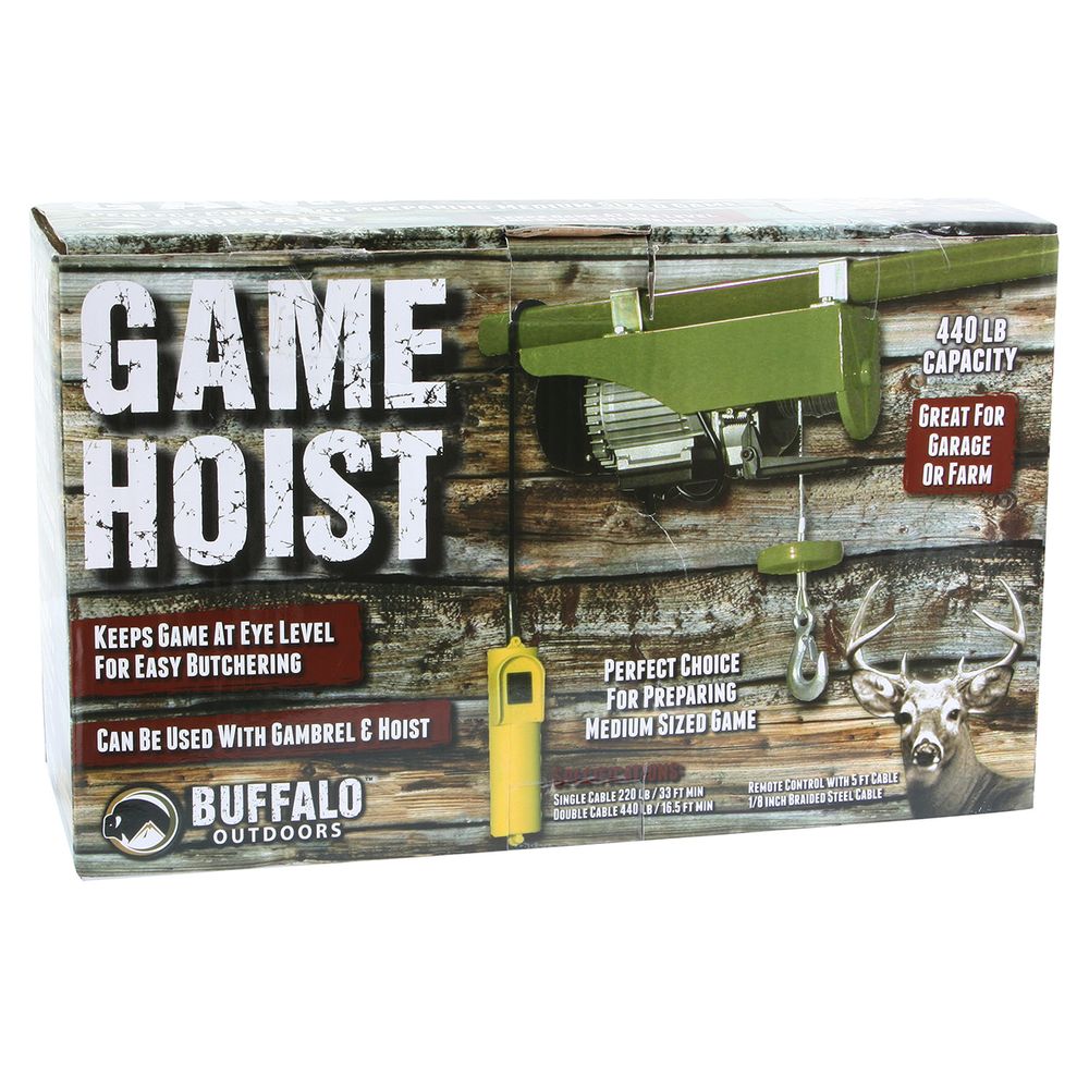 Use this Buffalo Outdoors™ Electric Game Hoist for lifting large game. With the lifting capacity of 440 pounds you can also use it to lift small engines, building supplies, transmissions or large shop equipment.