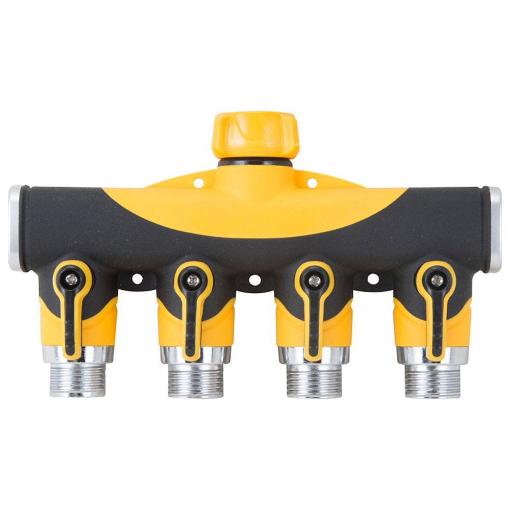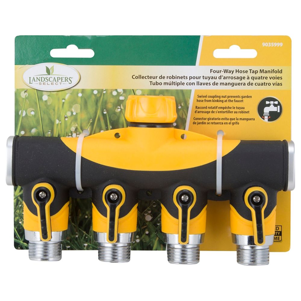 The swivel coupling nut prevents the garden hose from kinking at the faucet. Comfort rubberized finish body. Allows up to four hoses to be used.