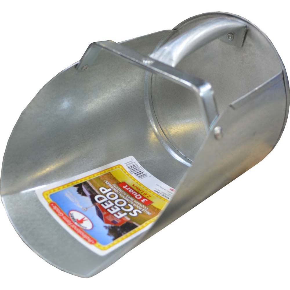 Ideal for scooping feed grains, this horse feed scoop holds 3 quarts. Measuring 7 in. long, 6-1/2 in. wide and 8-1/2 in. high, storing this feed scoop upright is easy with the flat bottom and sturdy construction. Enjoy long life and quality performance from this steel feed scoop that is strong enough to handle pelleted hay and grains.