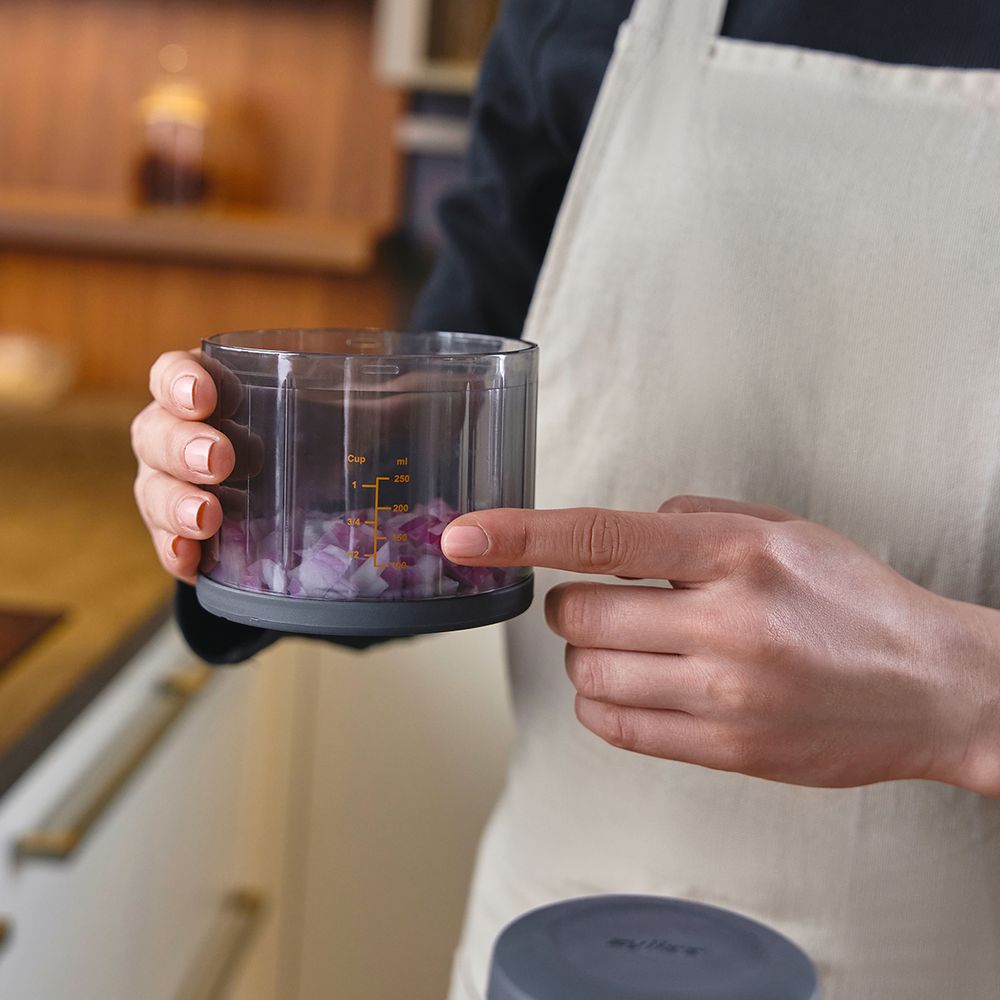 Speed up prep with the Zyliss Zick-Zick 3. Its rotating stainless steel blade delivers uniform cuts for veggies, nuts, and herbs with every press. Features a measured container, non-slip base, and a lockable design for compact storage.