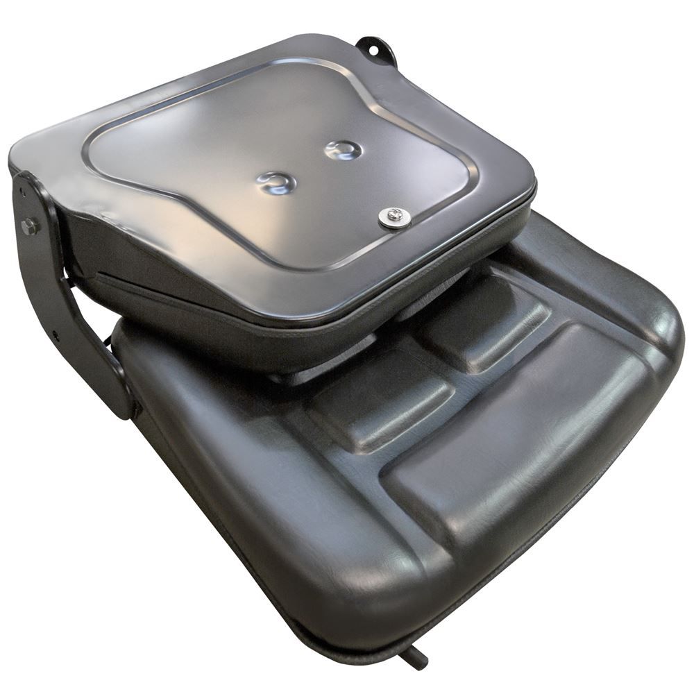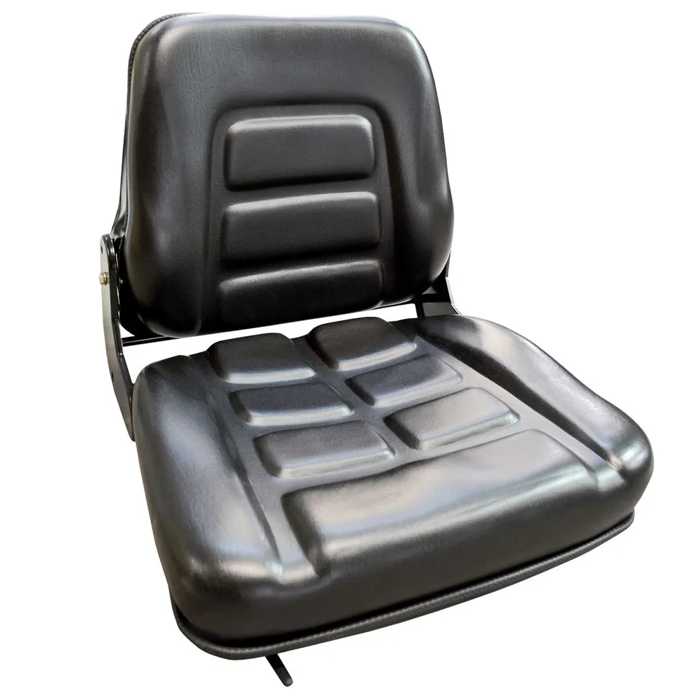 Sit comfortably in this universal forklift seat. The seat dimensions measure 23 inches wide and 21-1/4 inches deep. The overall height from the seat base to the top of the backrest measures 18-1/2 inches. The backrest is padded and it folds down when the seat is not in use. This forklift seat rests on slotted slides, this allows the seat to adjust forward or backward depending on the drivers desired seat placement. The seat can adjust from 5-1/2 inches on the slide to 13 inches. Overall, the covering construction is a heavy duty vinyl, which is durable and does not wear easily.