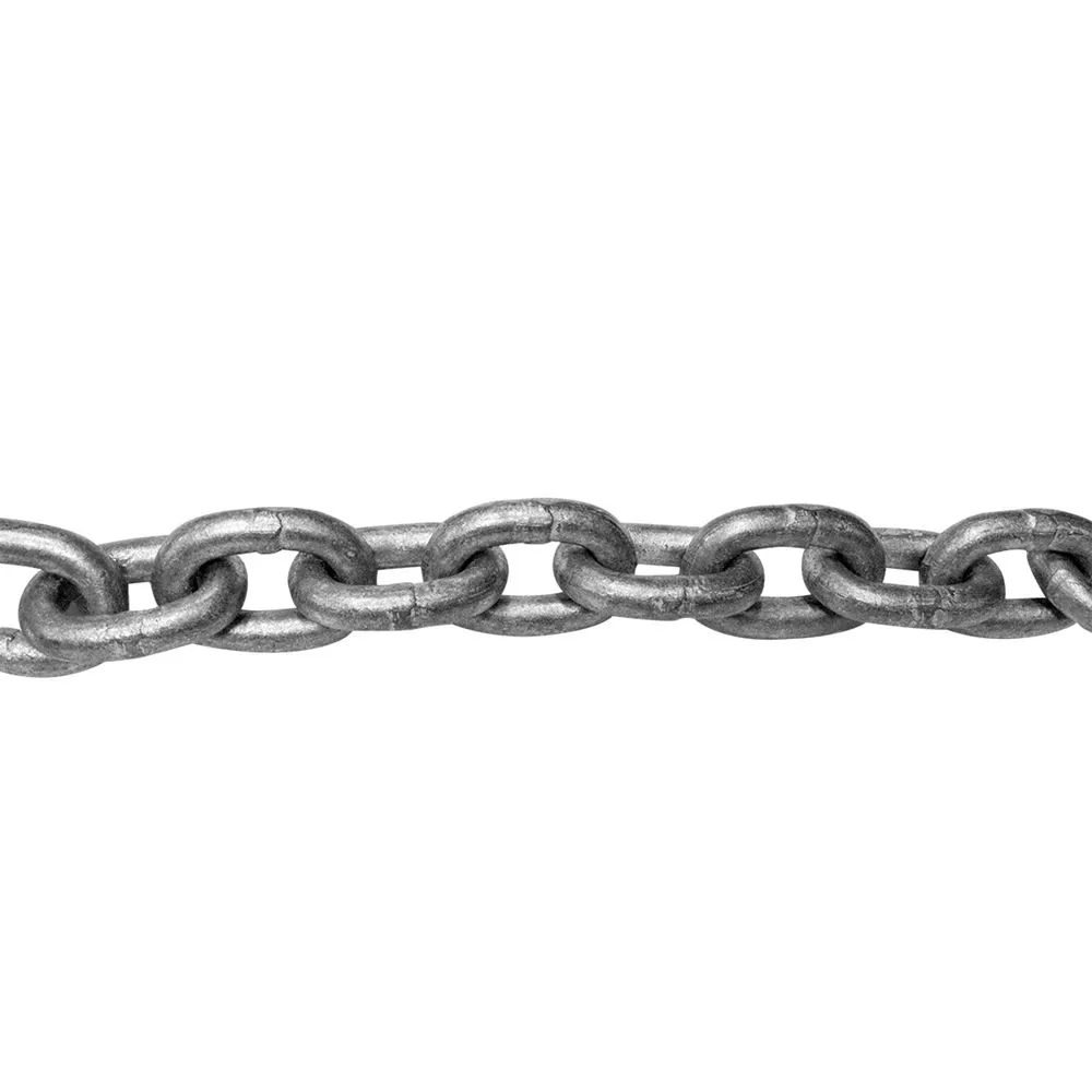 Use this grade 43 chain for a variety of heavy duty applications. It measures 3/8 inch and can support a maximum load capacity of 5,400 lbs. This high test chain is galvanized and sold by the foot.