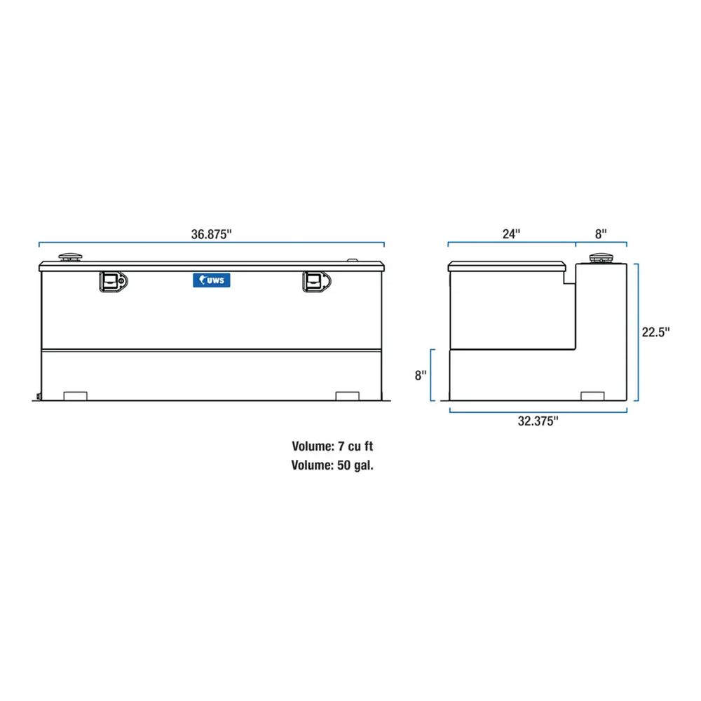 TT-50-Combo - Combo Transfer Aluminum Tread Plate Tank, The tank is designed to transport non-potable water and diesel fuel needed for many uses of contractor, agriculture, government, and other commercial applications. A commercial grade vented cap is standard as are stout mounting flanges. The tank is made with .125 H.D. aluminum alloy. The single lid box will open to a full 90 degrees; thus easily allowing it to be loaded with large and bulky items. Two super-duty lift cylinders help raise and hold the structural foamed lid open. It has an independent Steel lock and latch. It is made to not rust-ever and tough enough to last many years. This Combo tank will fit the following trucks - Chevy/GMC S-10/Colorado 92-09, S-10 Sport 97-09, S-10 4-DR 02-09, Colorado 4-DR SWB 02-09, Dodge Dakota 87-09, Dakota 4-DR Crew Cab 00-09, Dakota Ext Cab 05-09, ford LWB & SWB 87-08, Ranger Splash 92-01, Ranger Edge & Edge Super Cab 01-08, Nissan 87-97, Frontier 98-09, Frontier Crew & Ext. Cab 95-09, 4-door Crew 99-09, Toyota Tacoma Reg. Cab 89-09, Tacoma Crew Cab 01-04, Tacoma/Prerunner Double Cab & Access Cab 05-09, and T-100 & T-100 Ex. 93-99. The dimension for this Combo tank is 36" long x 32" wide x 22" tall.