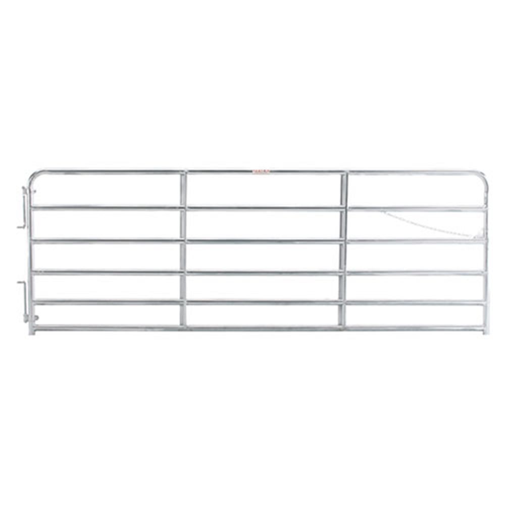 When constructing heavy duty compounds, install several bull gates for efficient access points if large feedlots occupy acres of land. The durability of this galvanized gate is extremely strong. It is constructed from 2 in. tubing with high-tensile strength and welded saddle joints, with 1 vertical "Z" brace for additional support. The corners are rounded with no sharp edges for the animals' safety. The bars are spaced out with 6 in total and the gate measures 8 feet in length when all of its hardware is attached. This 6 bar gate weighs 81 lbs., but is easy to maneuver when installed.