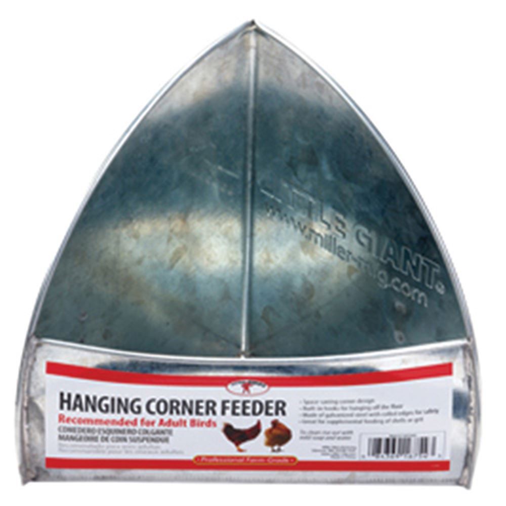 Use this corner feeder to provide additional nutrition for your chickens. Constructed of galvanized metal, this corner feeder has hooks for easy hanging. This feeder is intended for supplemental feed for adult birds.