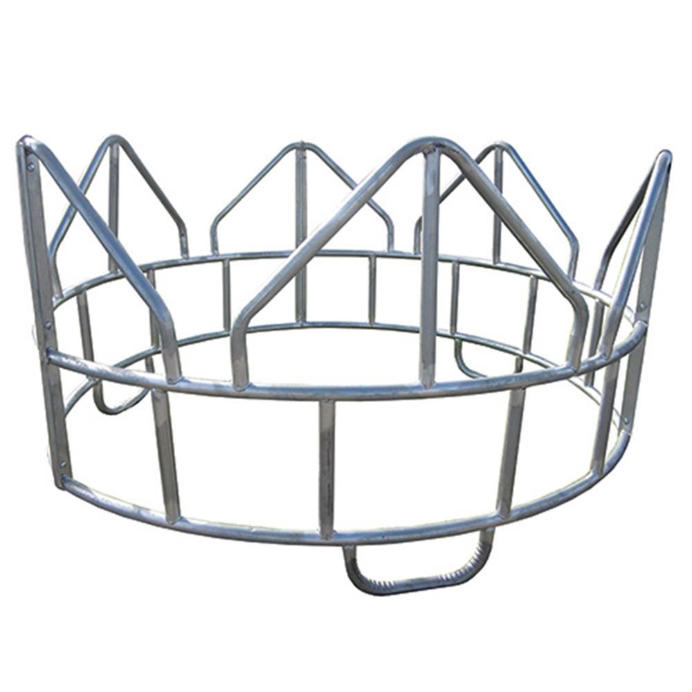 With a simple, 3 piece assembly, this galvanized horse feeder measures 8 ft. in diameter. Ideal for round bales of hay, this hay feeder is strong and durable, made to keep horses from getting inside the feeder with its A-frame design. Constructed with built-in legs, this horse feeder measures 53 in. high.
