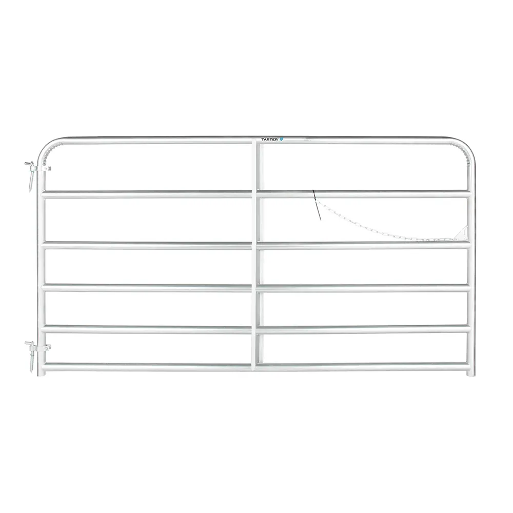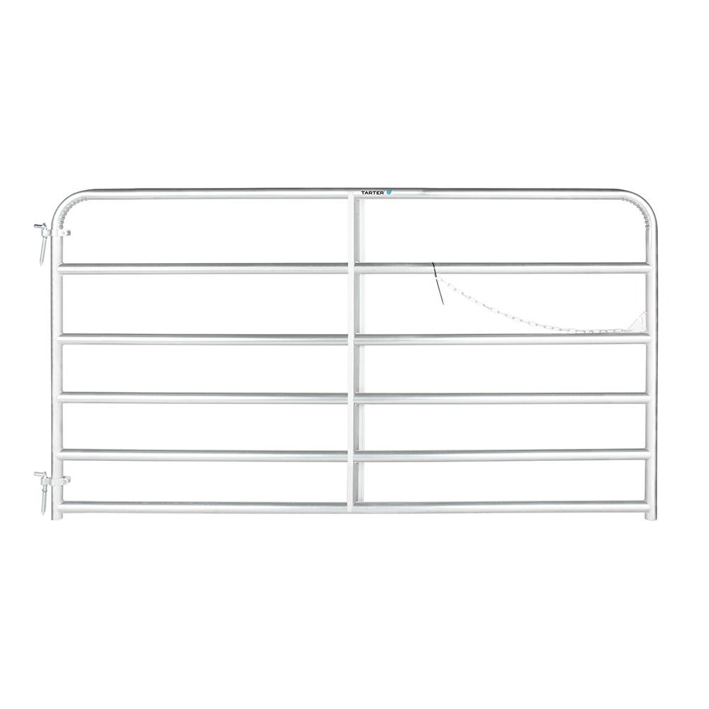 The 6-Bar Economy Galvanized Tube Gate has the quality, features and durable value you've come to expect from Tarter Gate. This gate is perfect for placement at construction sites, for crowd control, or for fencing pastures, orchards, and gardens. This 50" high gate has vertical "Z" Braces, this gate is made from 1-3/4" round high-tensile strength galvanized tubing with a superior continuous welded saddle joints. Gates come with 2 hinges, hinge pins and 22" snap chain, the 18' gate has 3 hinges and 3 hinge pins. All gates are 3" shorter than the listed length to allow for gate hardware and proper clearance. This gate is recommended for light confinement only. We stock the following sizes #29907 - 4', #29908 - 6', #29909 - 8', #29910 - 10', #29911 - 12', #29912 - 14', #29913 - 16', and #29914 - 18'.