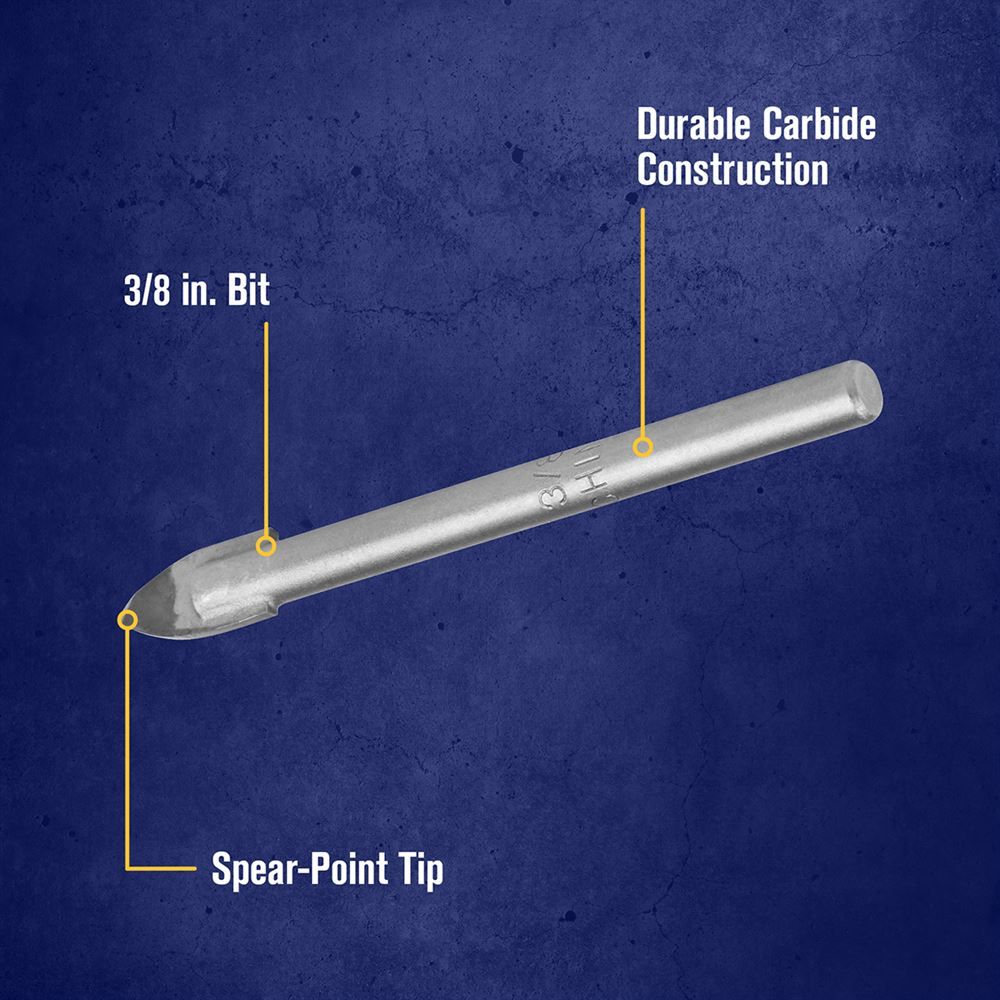 This 3/8" glass and tile drill bit with a carbide tip, drills through ceramic tile, mirrors, glass marble, and tile.