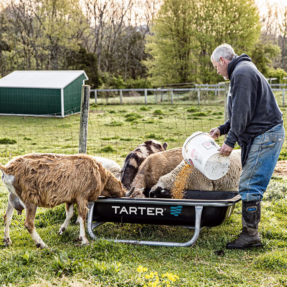 This versatile, lightweight feeder is built low to the ground to accommodate goats and all types of short-to-medium sized animals. Extremely durable, this is one of the sturdiest feeders of its kind on the market. The bunk liner is formed of 100% recycled materials. Its dimensions are 64" long x 27" wide x 14" high.