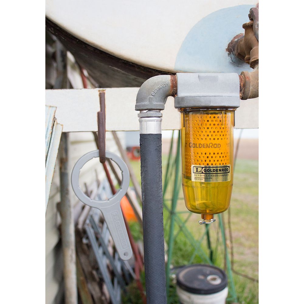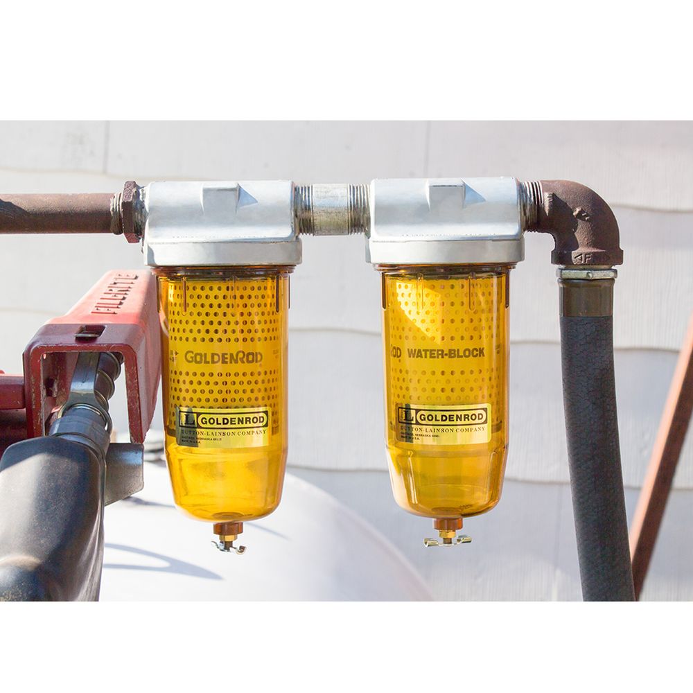 Water in diesel fuel can be extremely dangerous and cause shorter engine lives. Water can mix into fuel simply from condensation on the tank. This goldenrod fuel filter absorbs and works to eliminate most water particles as little as 10 microns. The fuel filter container measures 9-1/2 in. H x 4 in. D., and is translucent so the filtering process and water amount can always be seen. The cap on this water block fuel filter is a heavy duty zinc die cast with two, 1 in. fittings. Use the replacement filter ASC # 17424, Goldenrod Replacement Fuel Filter when the used one is worn.
