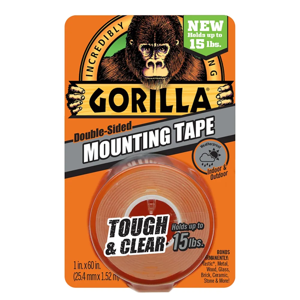 Secure your projects with Gorilla Mounting Tape Tough Clear Double-Sided. This 1-inch wide, 60-inch long tape holds up to 15 lbs and is ideal for indoor and outdoor use.