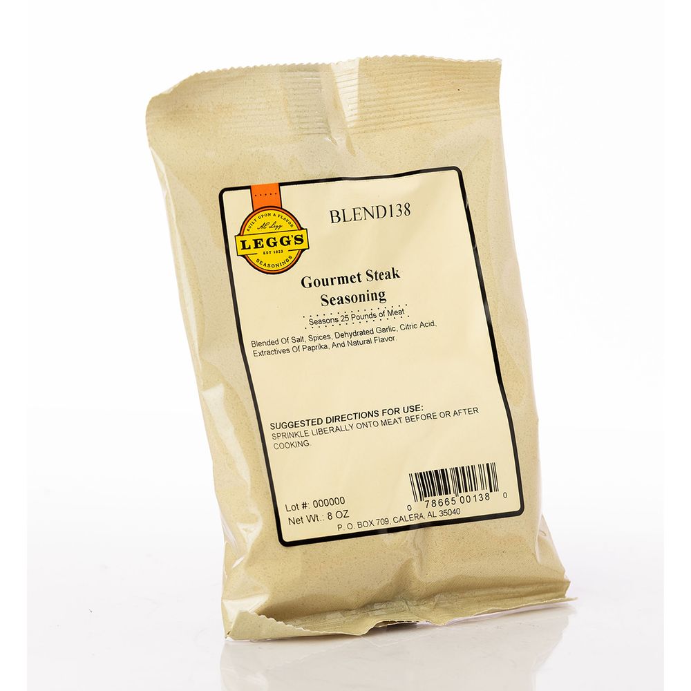 This 5-ounce pack of AC Legg's Gourmet Steak seasoning is a blend of spices and herbs specifically crafted to enhance the flavor of the steak.