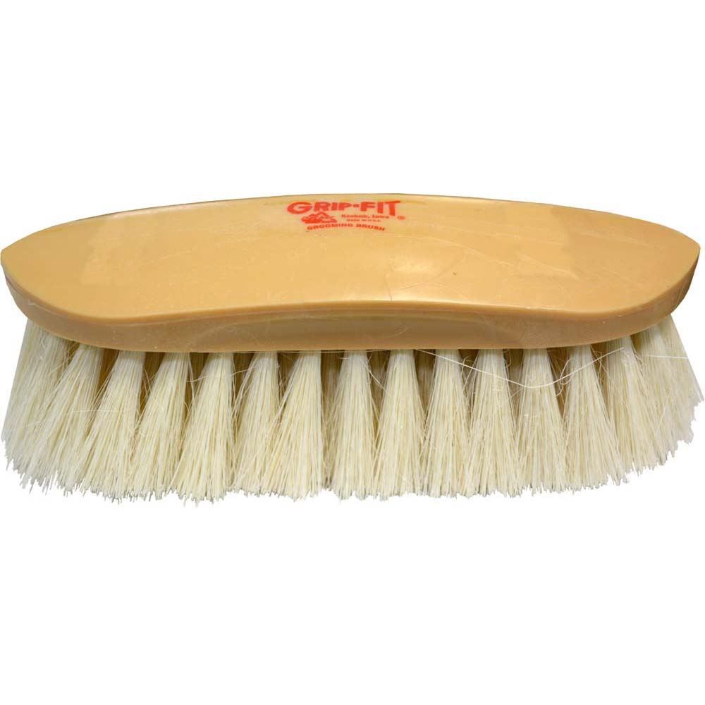 This Showman Grooming Brush is an off-white soft natural tampico soft-bristled brush with a full-size handle. The brush is trimmed with double contoured trim to provide more surface contact. The handle is made with GRIP-FIT® technology. Can be used to dust light dirt, loose hair, sheen the body, and groom sensitive areas.