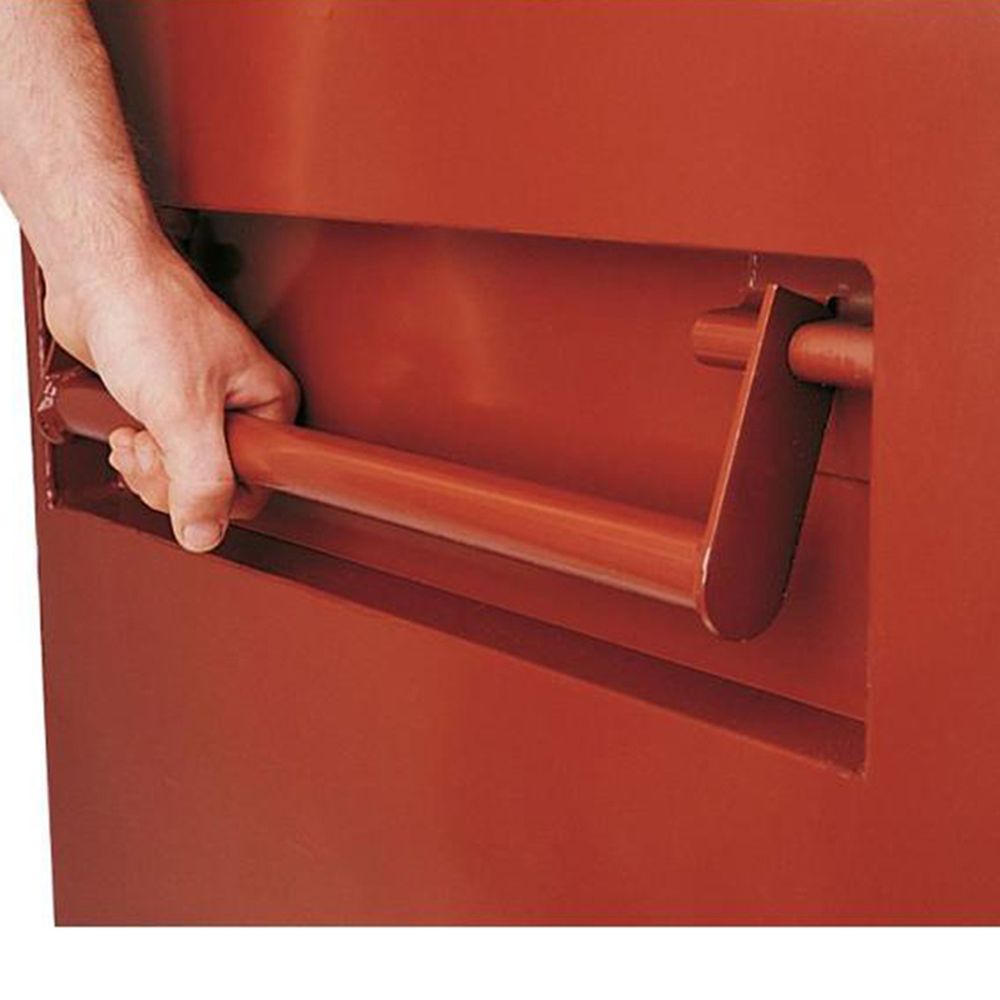 This Heavy Duty Steel Piano Box (By Delta) is the name in onsite tool storage. It is 30-1/2" wide x 49-7/8" height x 60" long and has 48 cubic feet of flexible storage space w/ two full length, deep heavy duty shelves. The bottom shelf tilts up to easily store bulk equipment in bottom. It has tall bottom bolsters for easy moving of a piano box with a forklift. The bolsters are wide and has a 12-gauge steel bottom flange. The wide flanges reinforce the body to resist bending. Textured, powder-coated paint finish enhances scratch- and chip-resistance. Bolt cutter proof locking system protects the padlocks inside the 12-gauge steel housing (pad locks not included) only the bottom of the pad locks are exposed, they cannot be cut, pulled or pried out. Two gas springs assist with opening and closing the door. Lifting handles are protected inside tall, deep recesses to prevent pinched knuckles and damage.