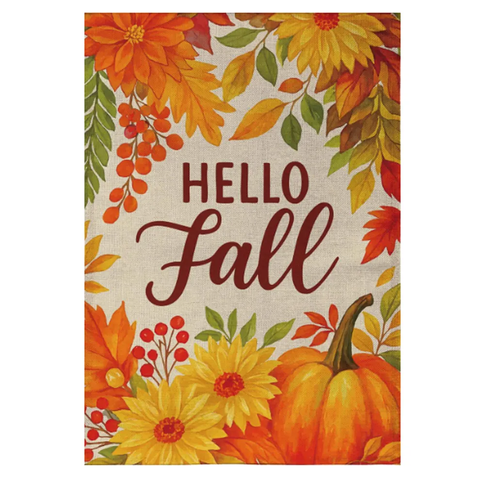 Welcome autumn with this Hello Fall Floral Bloom Burlap Garden Flag featuring flowers and a pumpkin in fall colors.