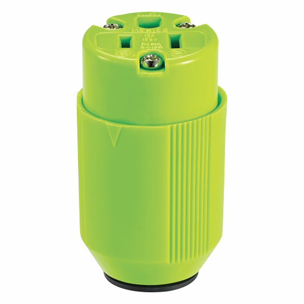This Eaton Auto Grip Straight Blade Connector is Hi-Vis green and features 2-pols and has an amperage rating of 15A.