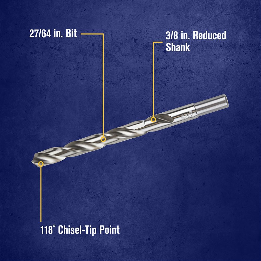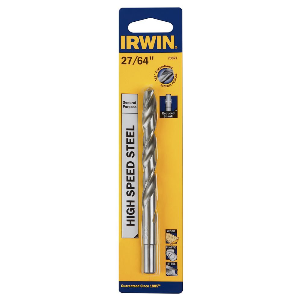 This 27/64" general-purpose steel drill bit is constructed of M-2 high-speed steel for the best combination of strength, heat resistance, and wear. It has a 118-degree point for use in wood, metal, and plastic.