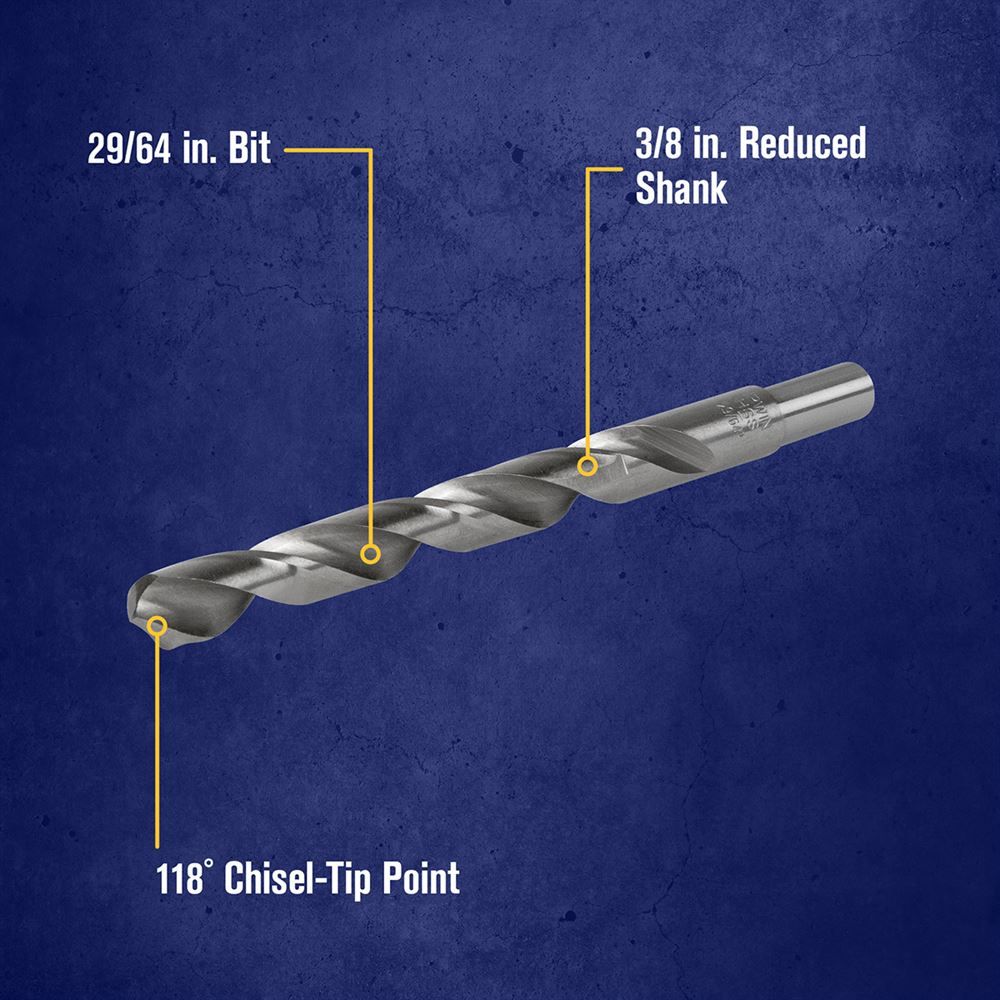 This 29/64" general-purpose steel drill bit is constructed of M-2 high-speed steel for the best combination of strength, heat resistance, and wear. It has a 118-degree point for use in wood, metal, and plastic.