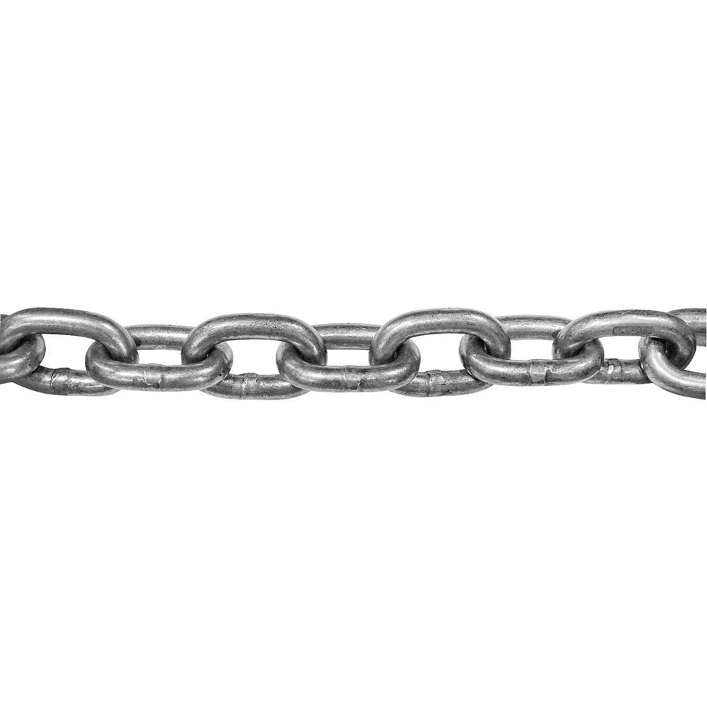 Use this high test utility chain for binding loads, towing applications and more. This high test chain has a working load limit of 5,400 lbs. This grade 43 chain has a link size of 3/8 inch and measures 16 feet long. Each end has a clevis hook that is already installed. Do not use this chain for overhead lifting applications.